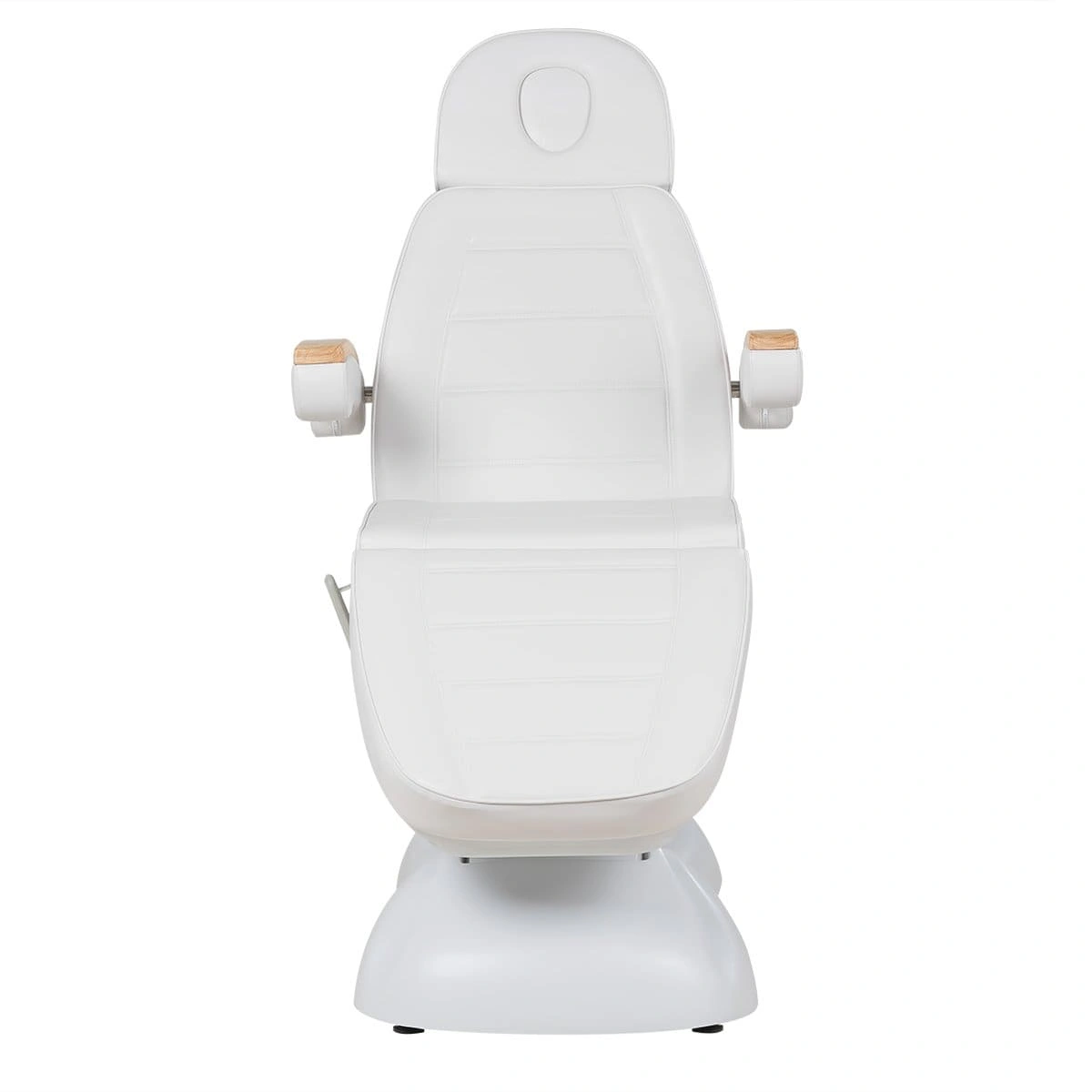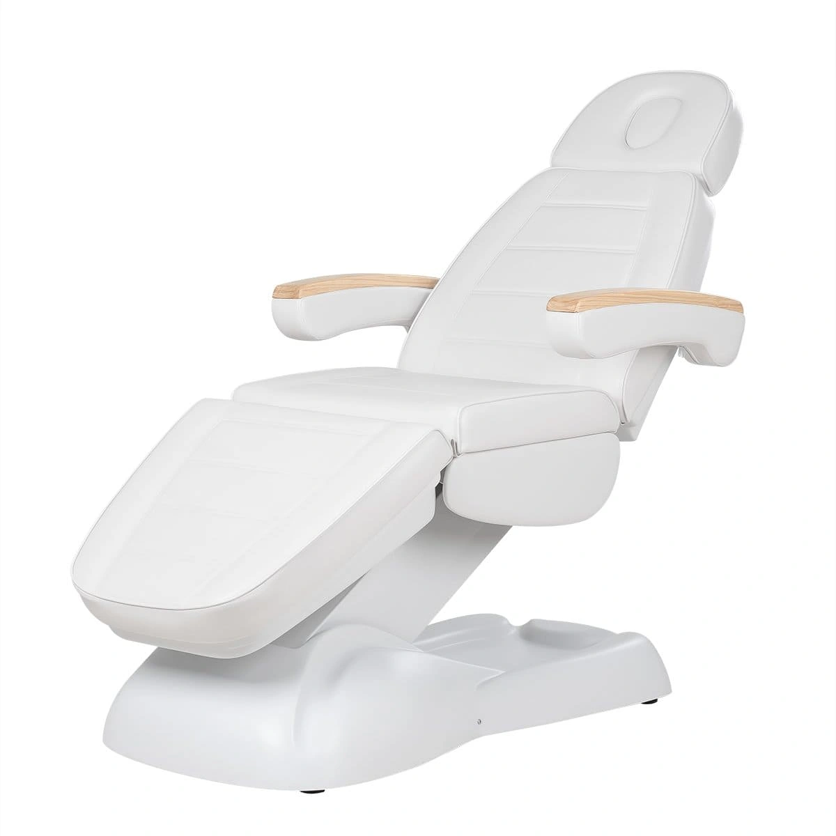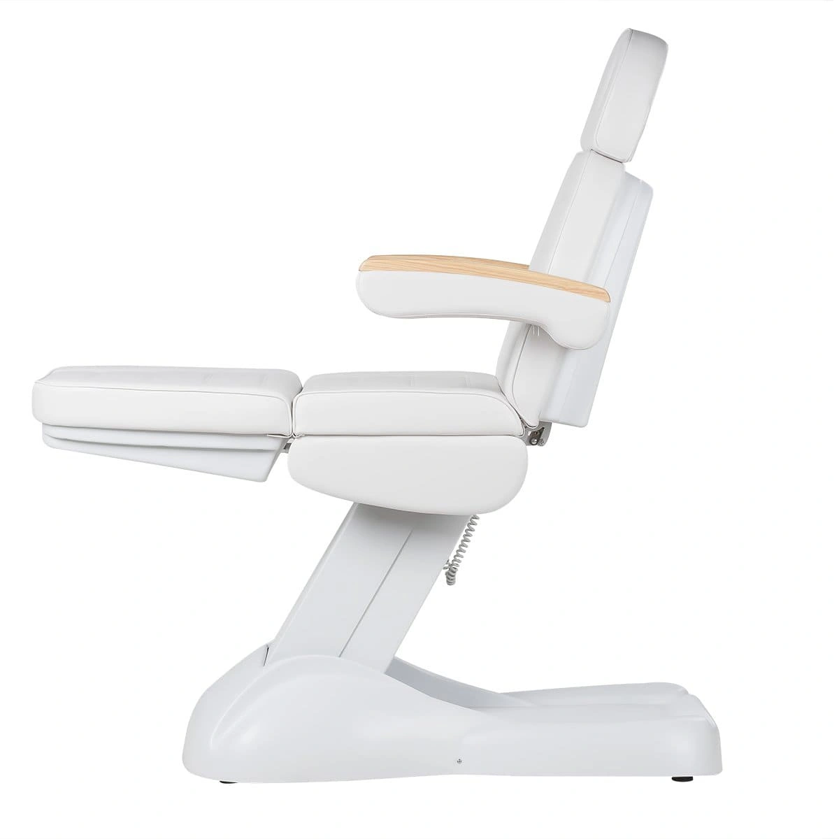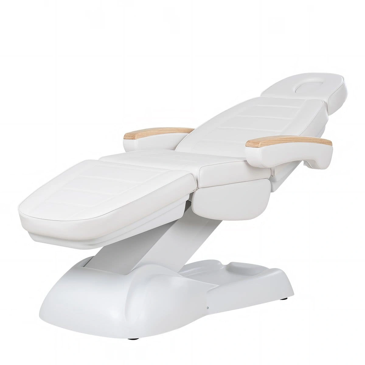 Кресло полностью раскладывается в горизонтальное положение, имеются подголовник с отверстием для лица и съёмные подлокотники со стильными деревянными вставками. Модель можно использовать для различных процедур: наращивание ресниц, педикюр, косметология, оформление бровей и т.д.