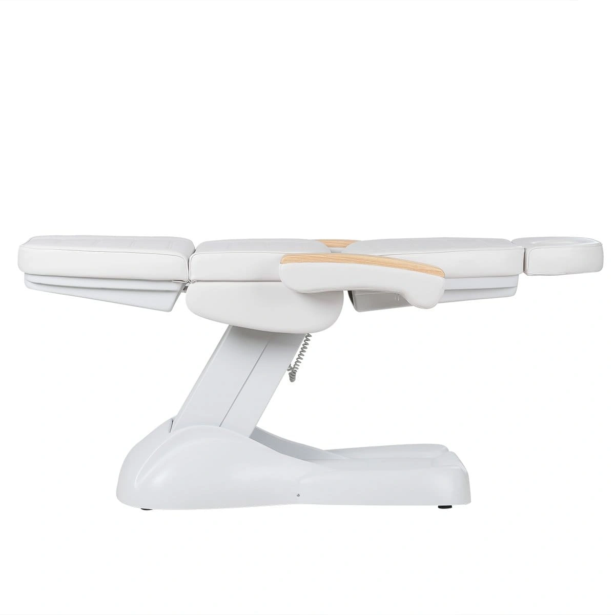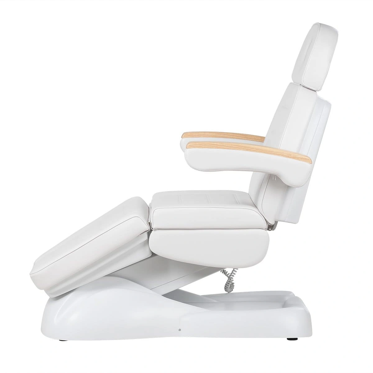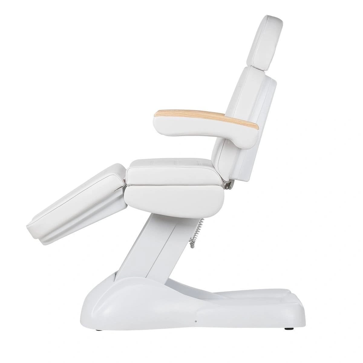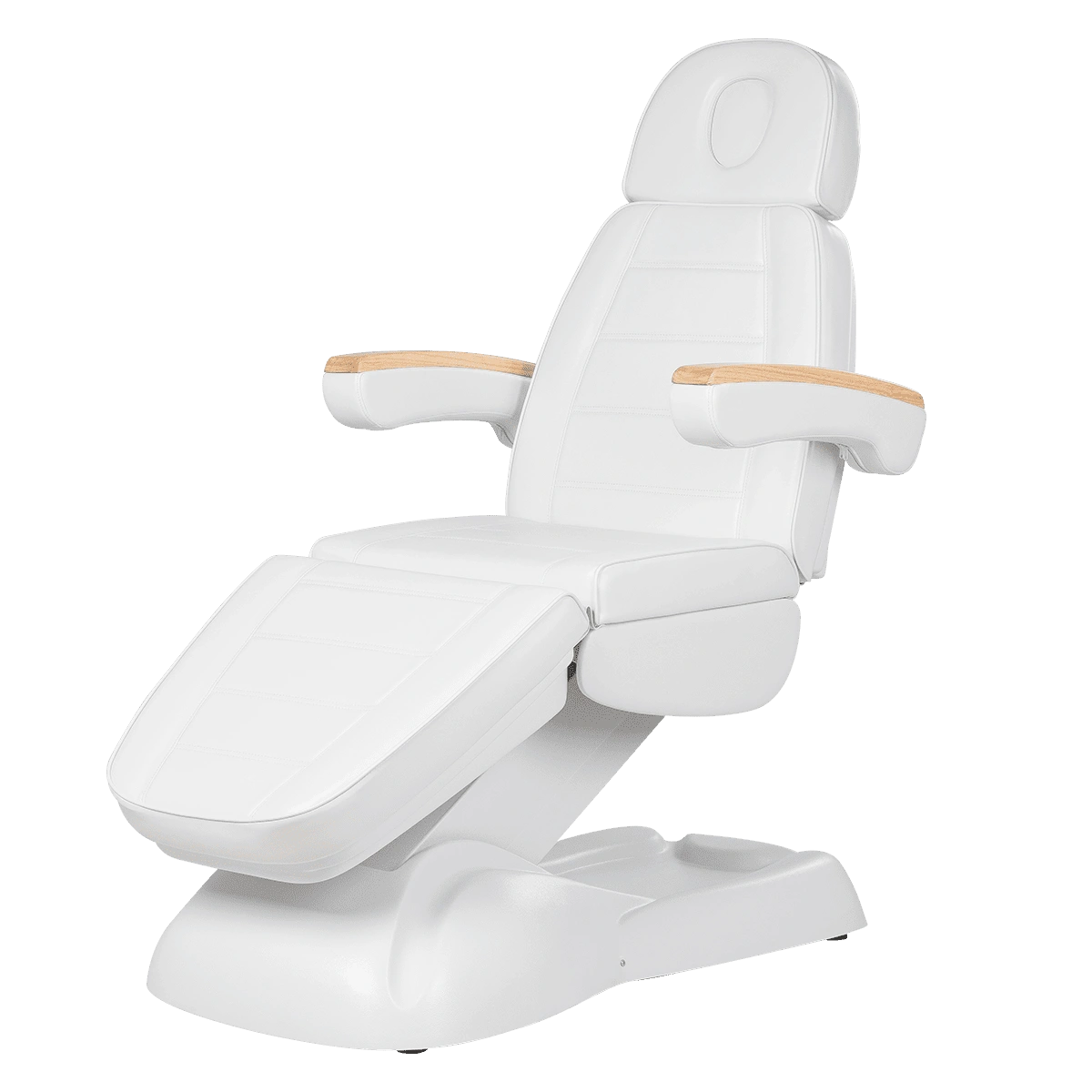 Кресло полностью раскладывается в горизонтальное положение, имеются подголовник с отверстием для лица и съёмные подлокотники со стильными деревянными вставками. Модель можно использовать для различных процедур: наращивание ресниц, педикюр, косметология, оформление бровей и т.д.
