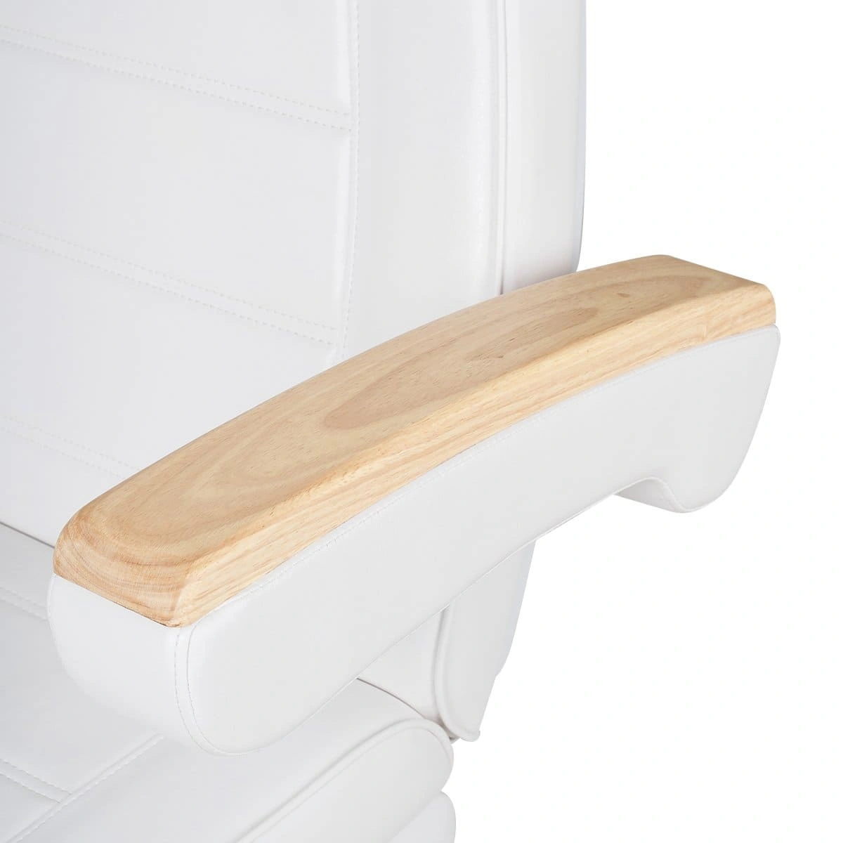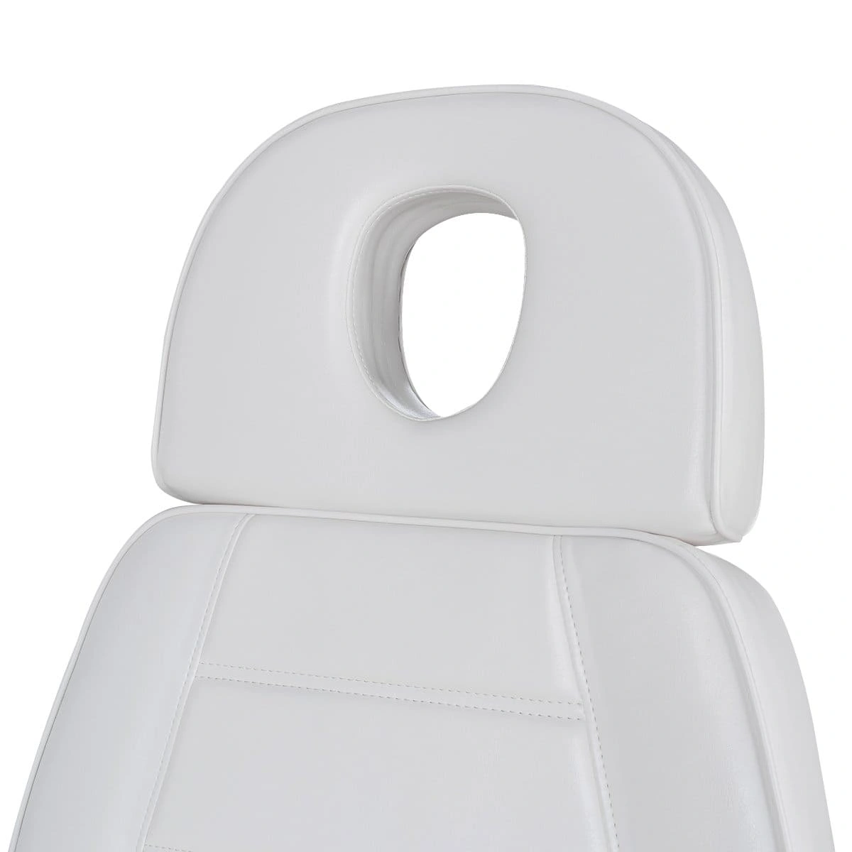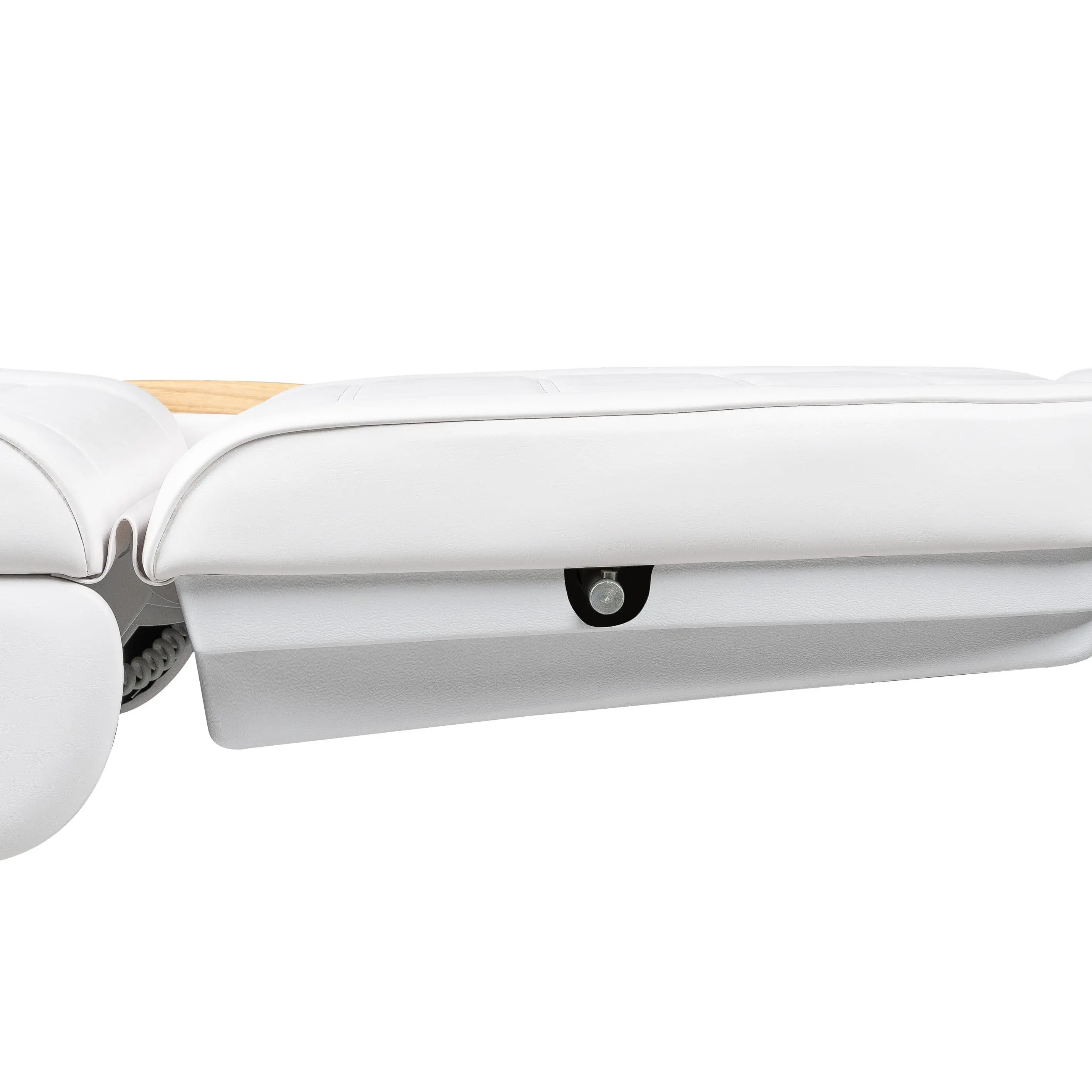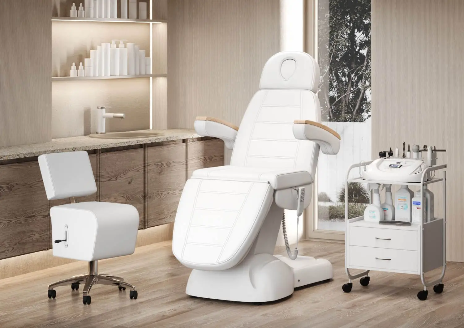 Кресло полностью раскладывается в горизонтальное положение, имеются подголовник с отверстием для лица и съёмные подлокотники со стильными деревянными вставками. Модель можно использовать для различных процедур: наращивание ресниц, педикюр, косметология, оформление бровей и т.д.