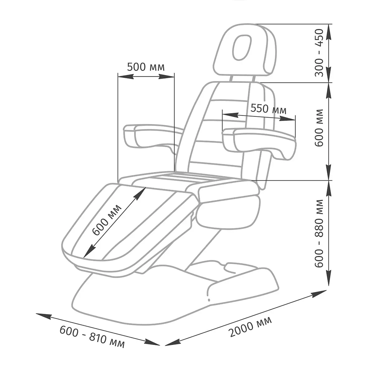 Длина и ширина подлокотников: 550 и 80 мм;