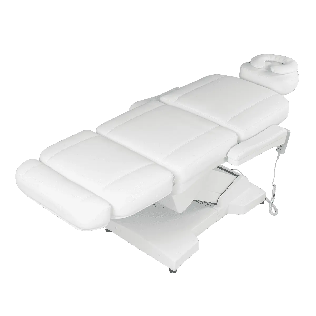 Комплектация: основание на подпятниках, каркас, мягкие элементы (сиденье, спинка и подушка под ноги, подголовник с отверстием для лица и подлокотники), электропривод 4 мотора, пульт управления.