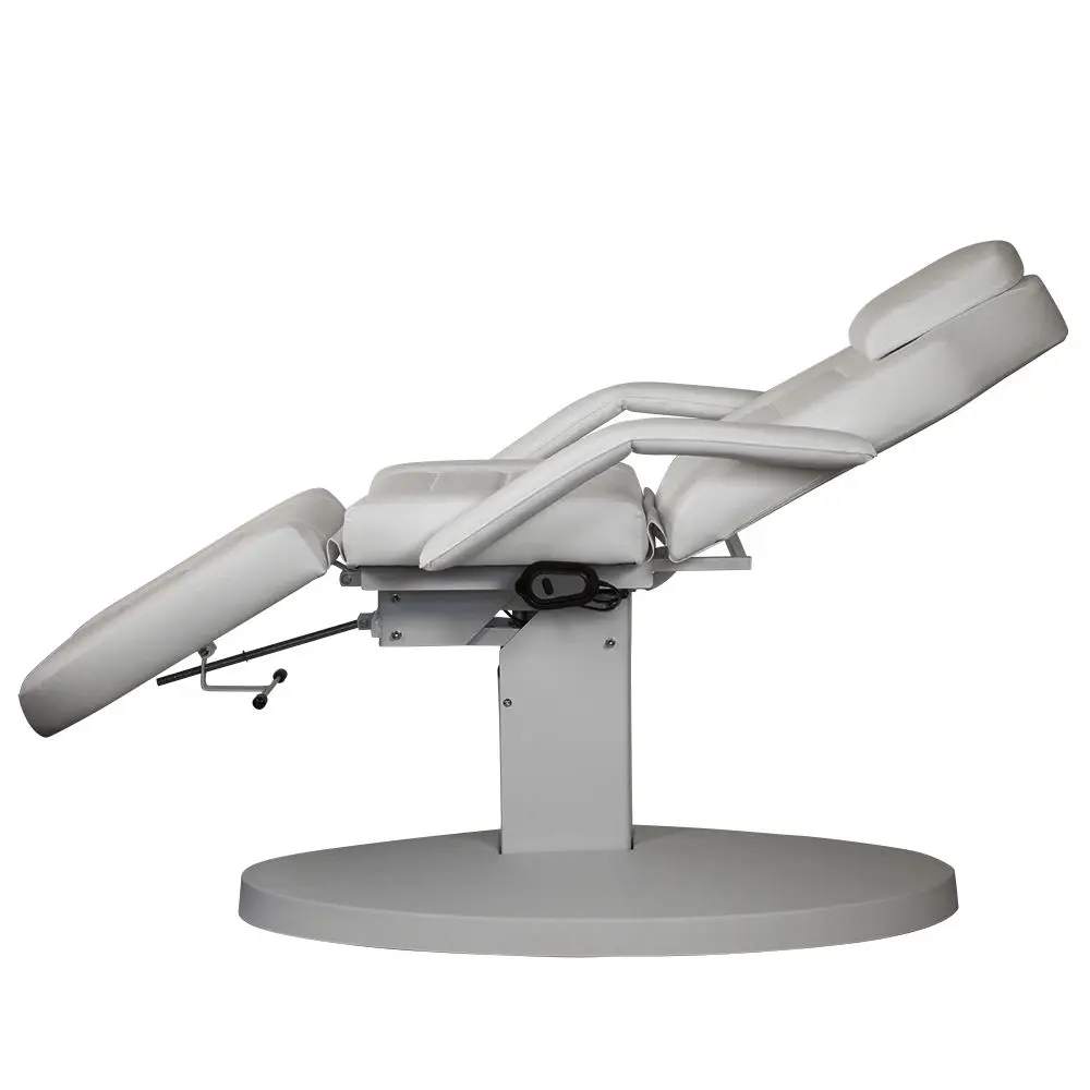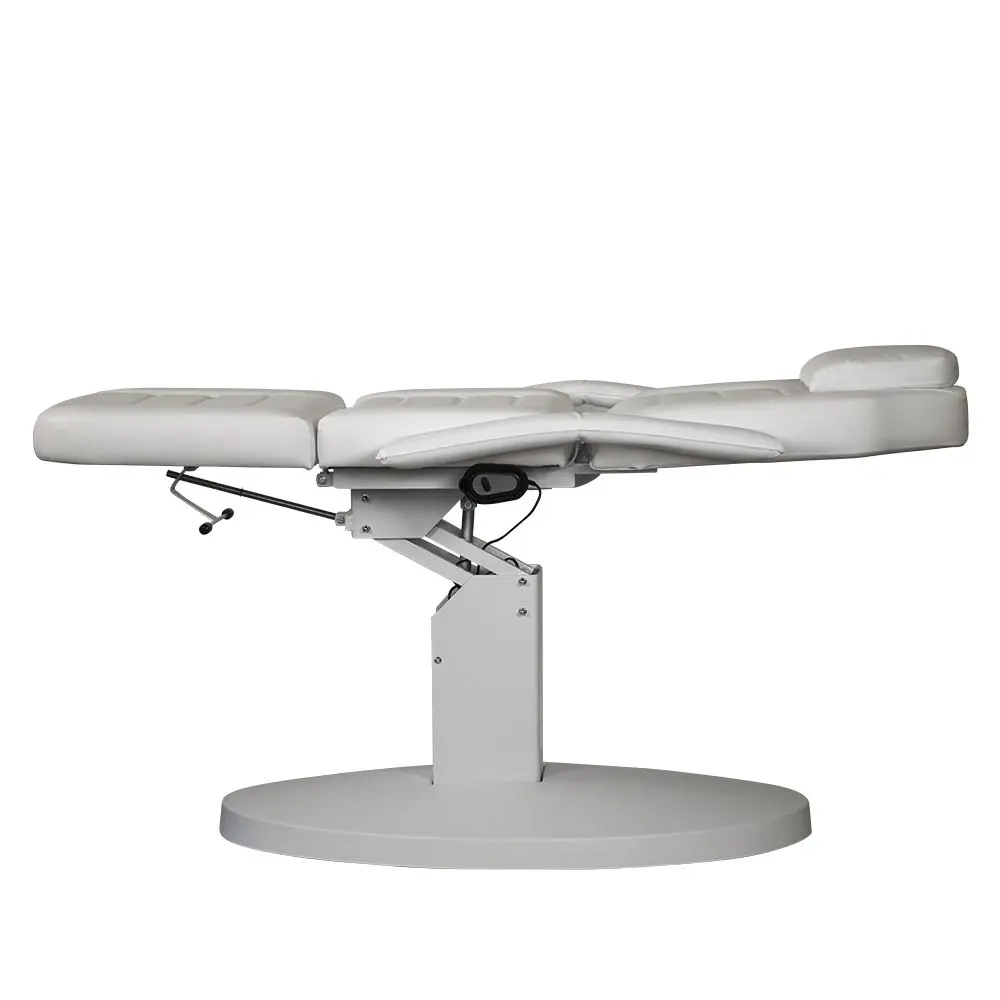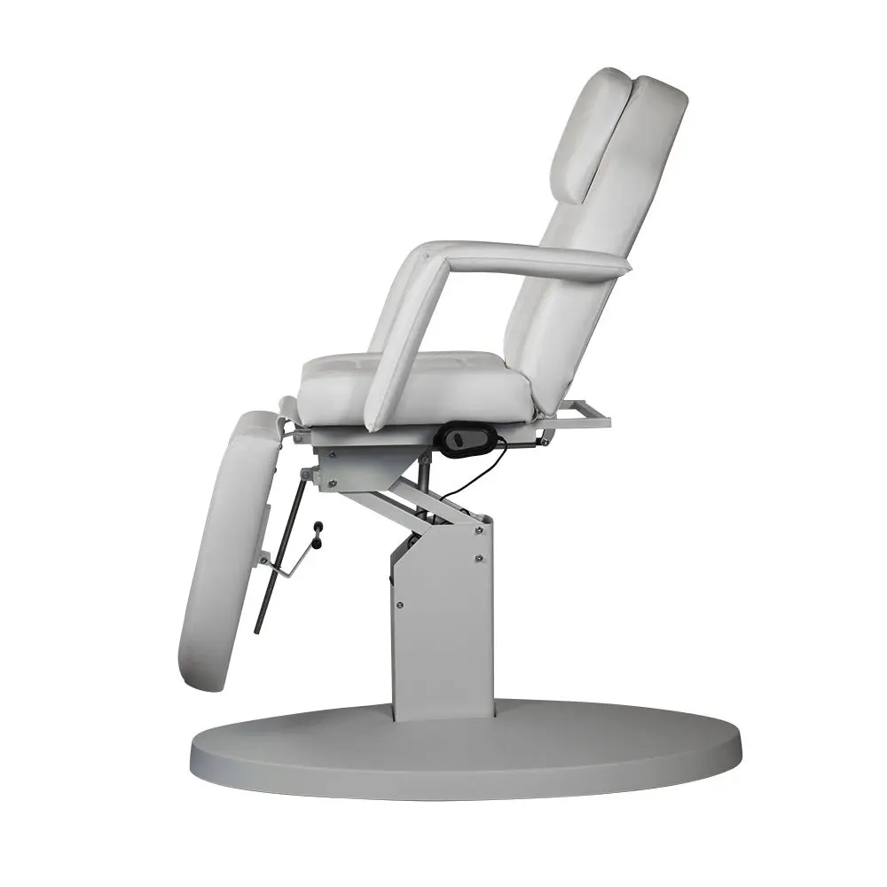 Высота меняется с помощью электропривода. Управление осуществляется с удобного пульта. Педикюрное оборудование можно трансформировать в кушетку, разложив до горизонтального положения. Подголовник и подлокотники можно снять при необходимости. В спинке есть специальное отверстие для лица. Благодаря этому кресло можно использовать в массажном кабинете.
