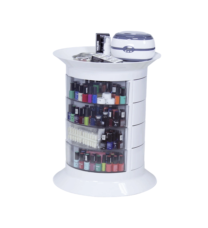 На верхней полочке можно положить инструмент первой необходимости. Остальные приспособления вместе с косметологическими средствами можно компактно разместить в ящиках, которые свободно и бесшумно выдвигаются. Для часто используемых принадлежностей предусмотрены 4 прозрачных ящичка. Мастер с легкостью найдет нужный инструмент или средство, не открывая ящик. Для быстрого перемещения по рабочей зоне тележка укомплектована маневренными колесиками. Установить оборудование можно даже в помещениях с маленькой площадью благодаря компактным размерам.