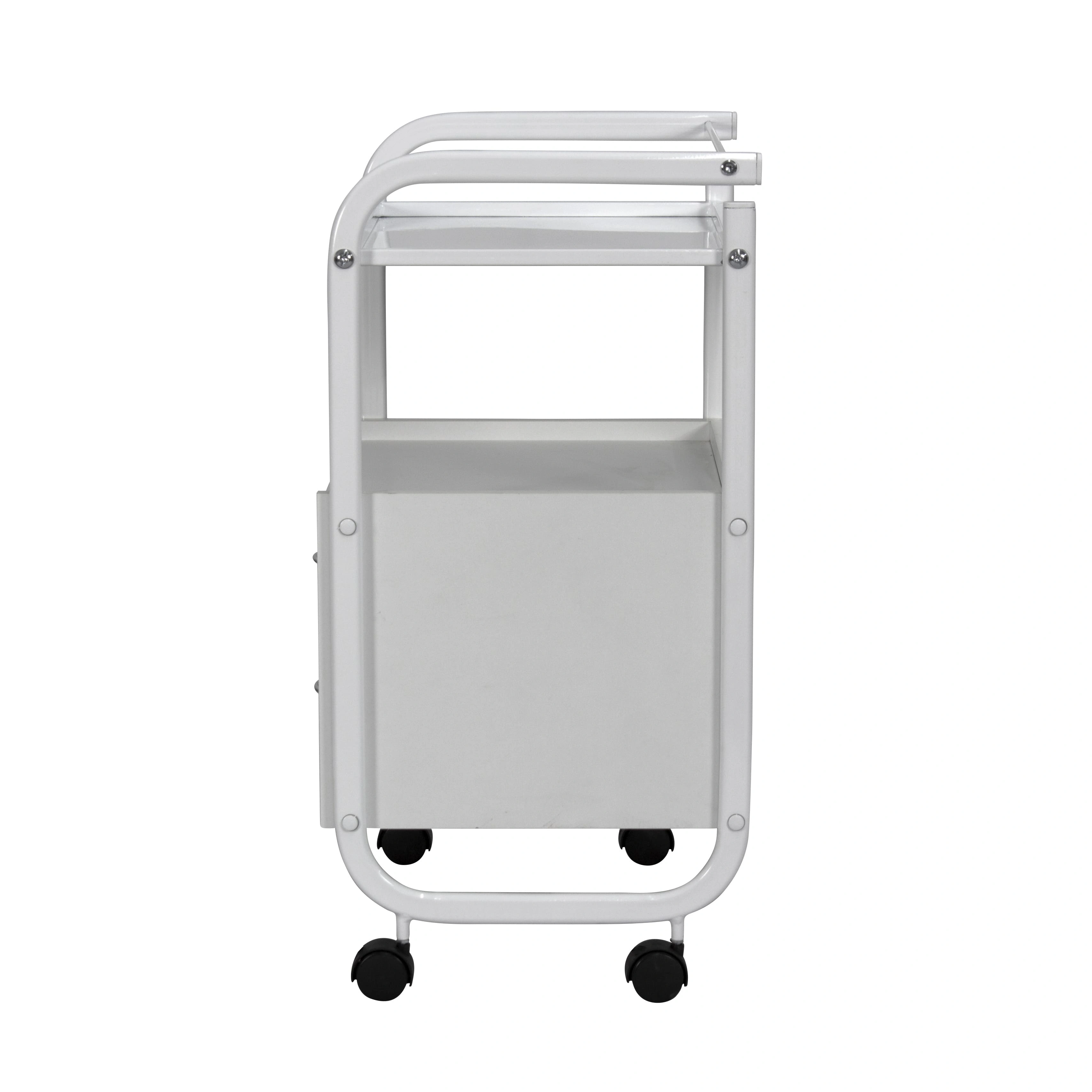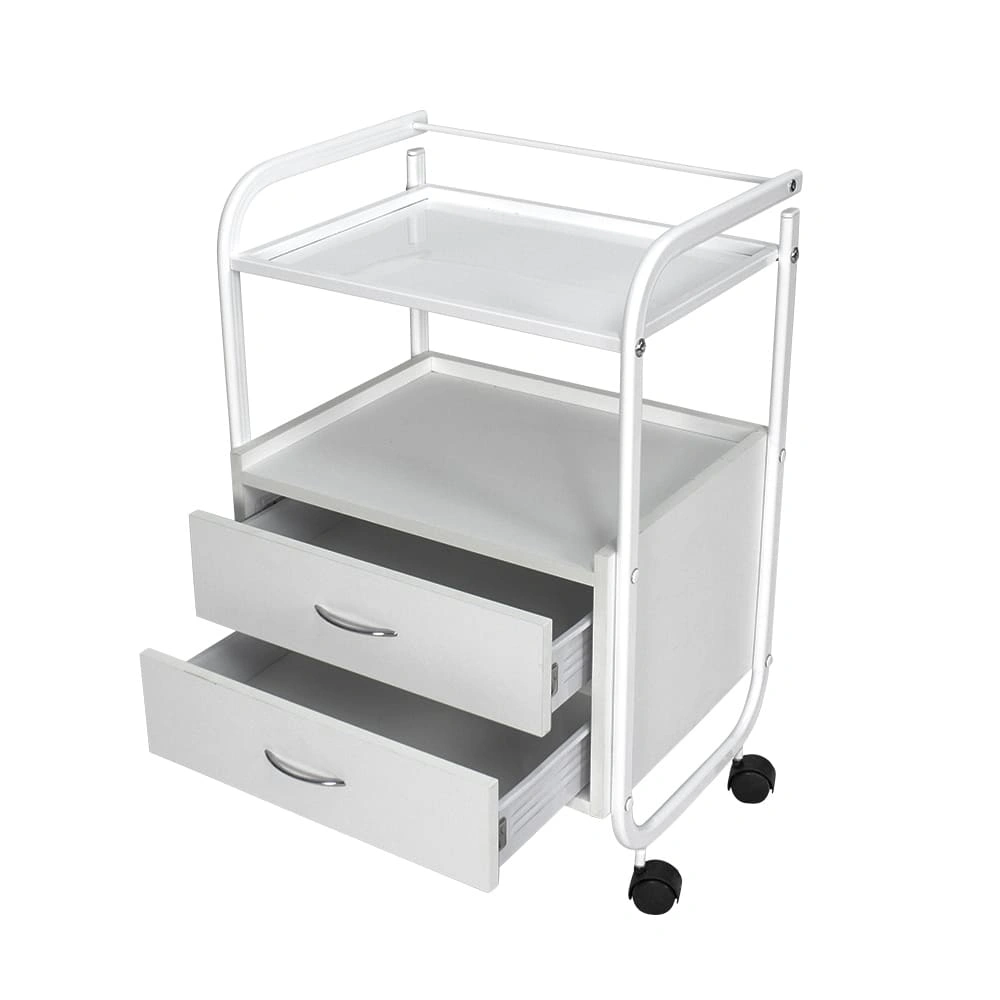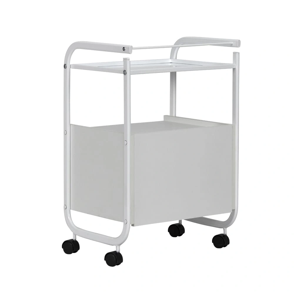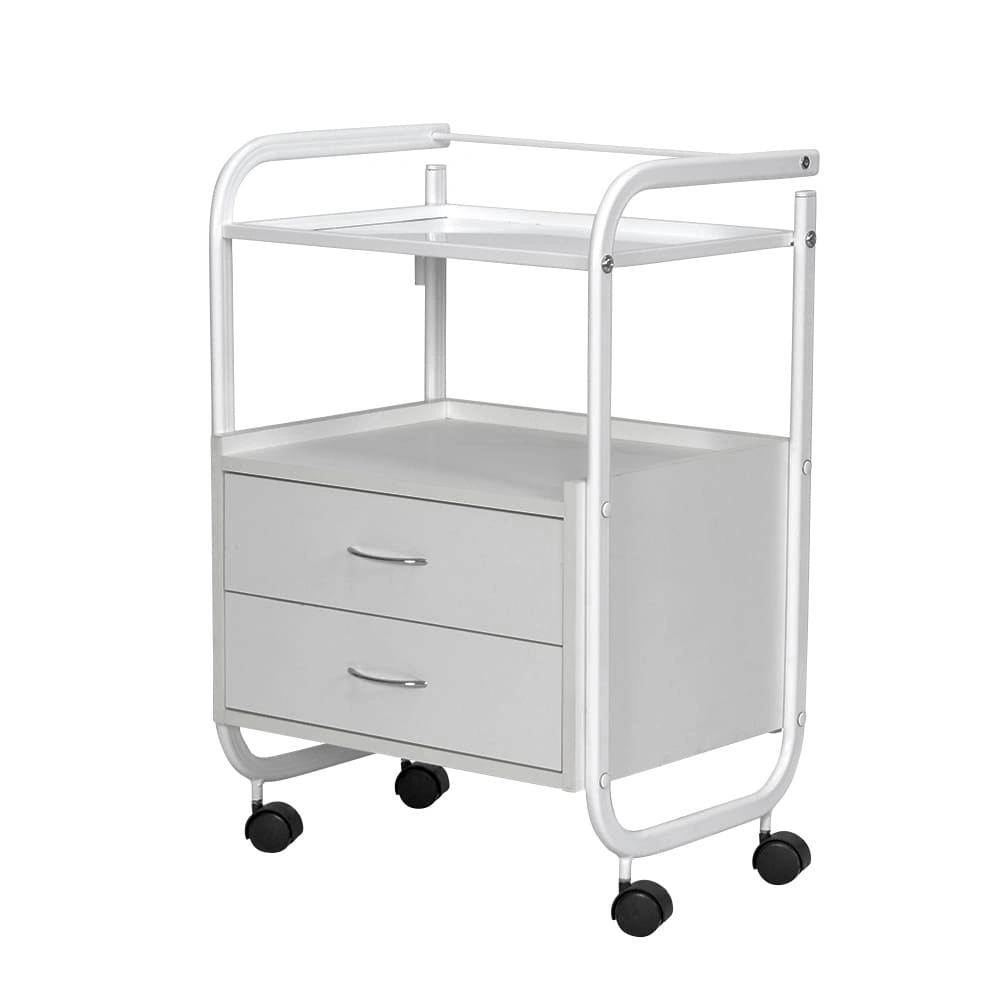 Стоит отметить, что данное косметологическое спецоборудование исполнено из прочного долговечного металла, покрытого специфическим влагоотталкивающим покрытием, за счёт чего тележка не поддаётся коррозии. За таким оборудованием легко ухаживать, ведь покрытие выдерживает влагу и дезинфицирующие средства. Каркас косметологической тележки состоит из металлической полочки с бортиками и тумбочки с двумя выдвижными ящичками. На верхней полочке удобно расположить инструменты, использующиеся во время работы. А удобный бортик защитит от случайного падения инструмента. Во вместительной тумбе с двумя ящиками поместиться остальной инвентарь. Над тумбой под полочкой также можно хранить инвентарь, например высокие баночки или небольшую косметологическую технику.