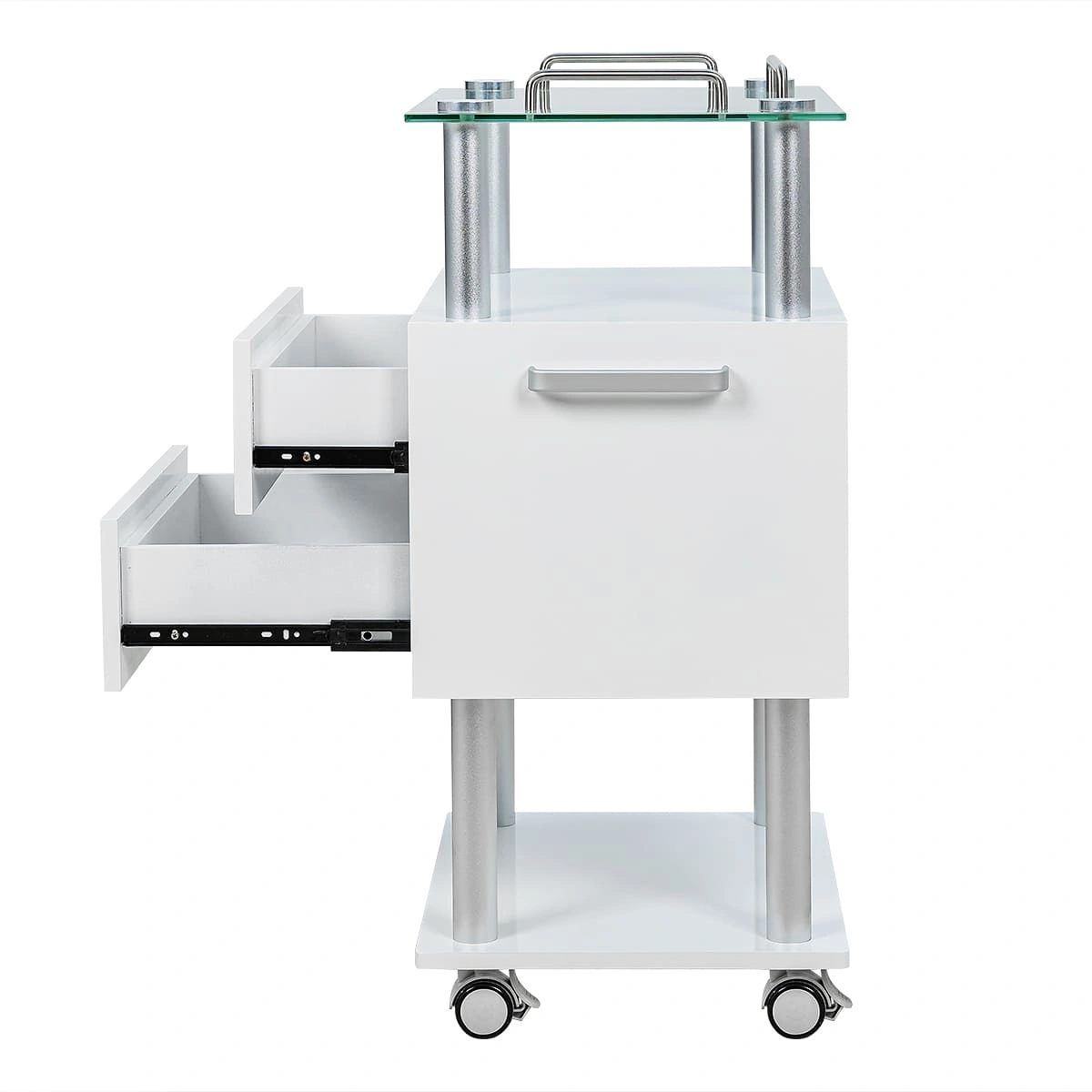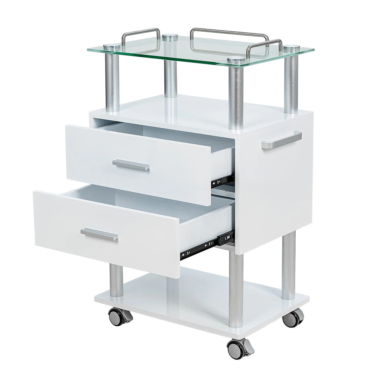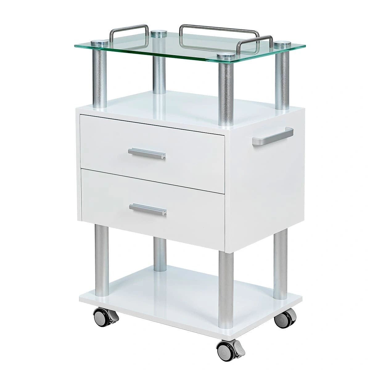 Тумбочка состоит из каркаса в виде хромированных труб, внизу и вверху расположены две открытые полки, на которых мастер может удобно разместить инструменты и принадлежности, исходя из своих предпочтений и проводимой процедуры. Для расходных материалов и аксессуаров между полками находятся два закрытых вместительных ящика. Сверху столика размещена стеклянная полка с хромированными бортиками, которые защищают хранящиеся на столике предметы от падения.