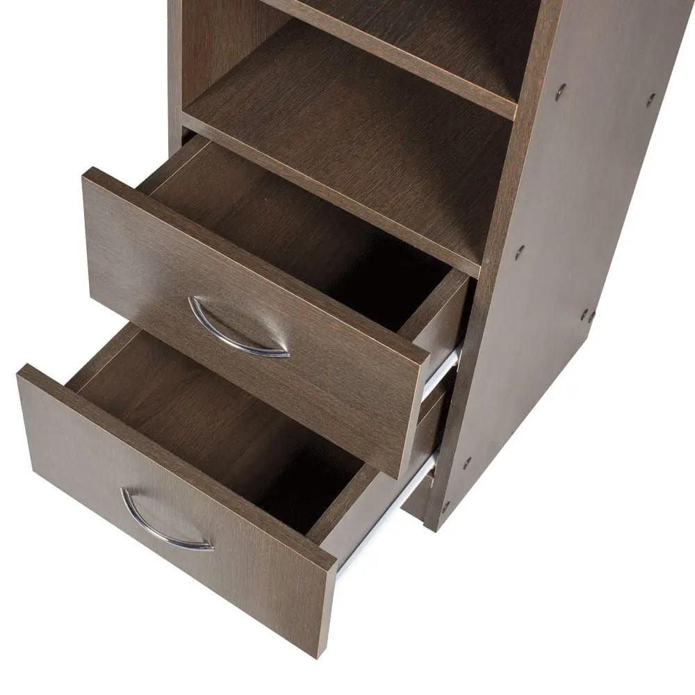 Тумба: каркас, ящики и полки из ламинированной ДСП, для открывания дверок предусмотрены ручки из хромированного металла.