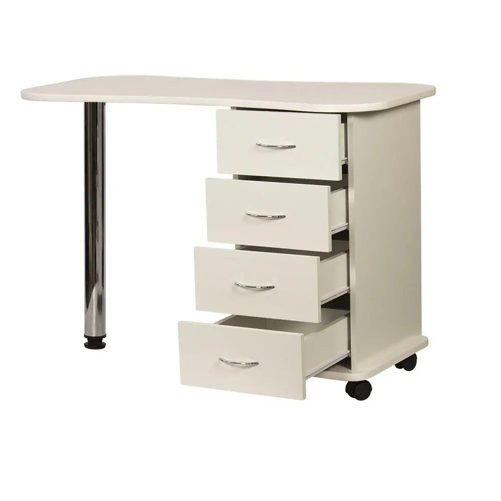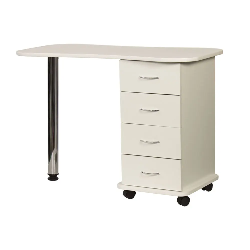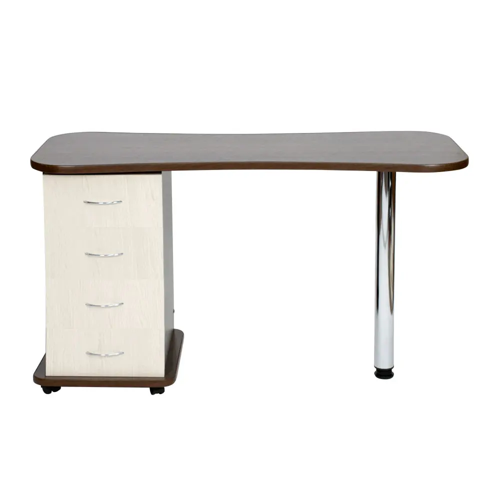 Функциональный и практичный стол маникюрный Эсти от производителя МЭДИСОН. В комплектацию входит столешница, тумба на колесах и хромированная ножка на подпятнике. Для производства данного стола применяется качественный материал – ЛДСП, поверхность которого устойчива к воздействию влаги, косметических и дезинфицирующих средств. Вместительная тумба закрытого типа с четырьмя удобными выдвижными ящиками. Дверки ящиков оснащены хромированными ручками.