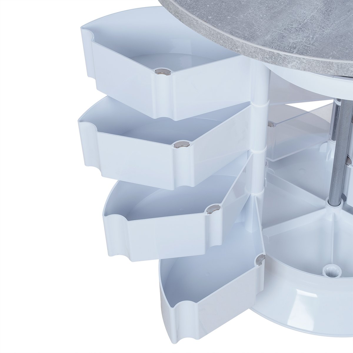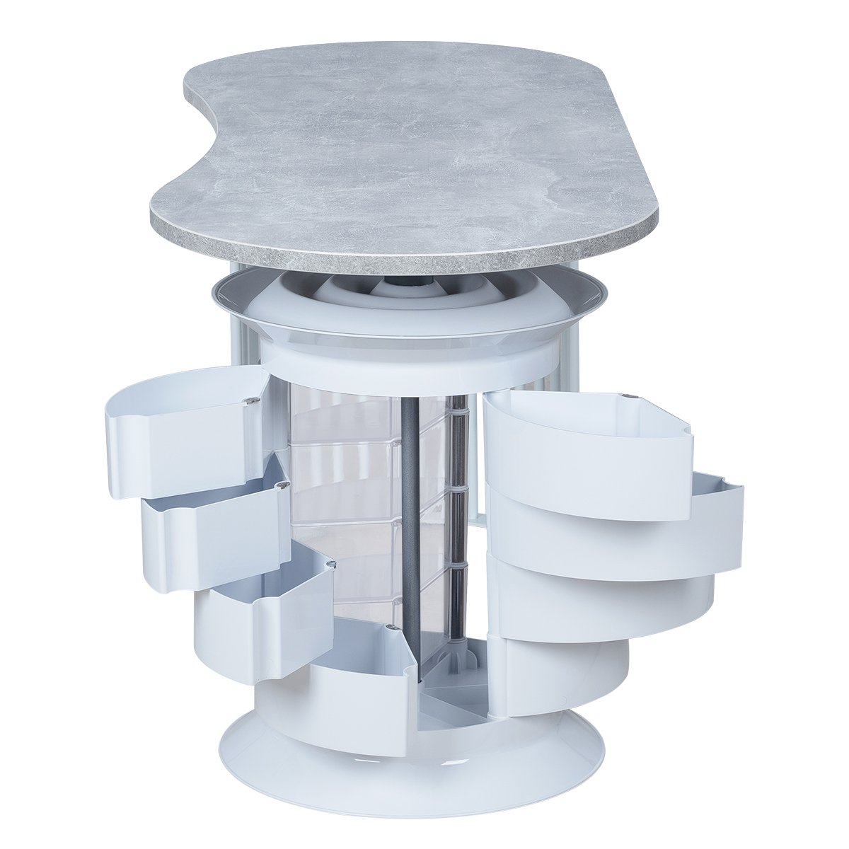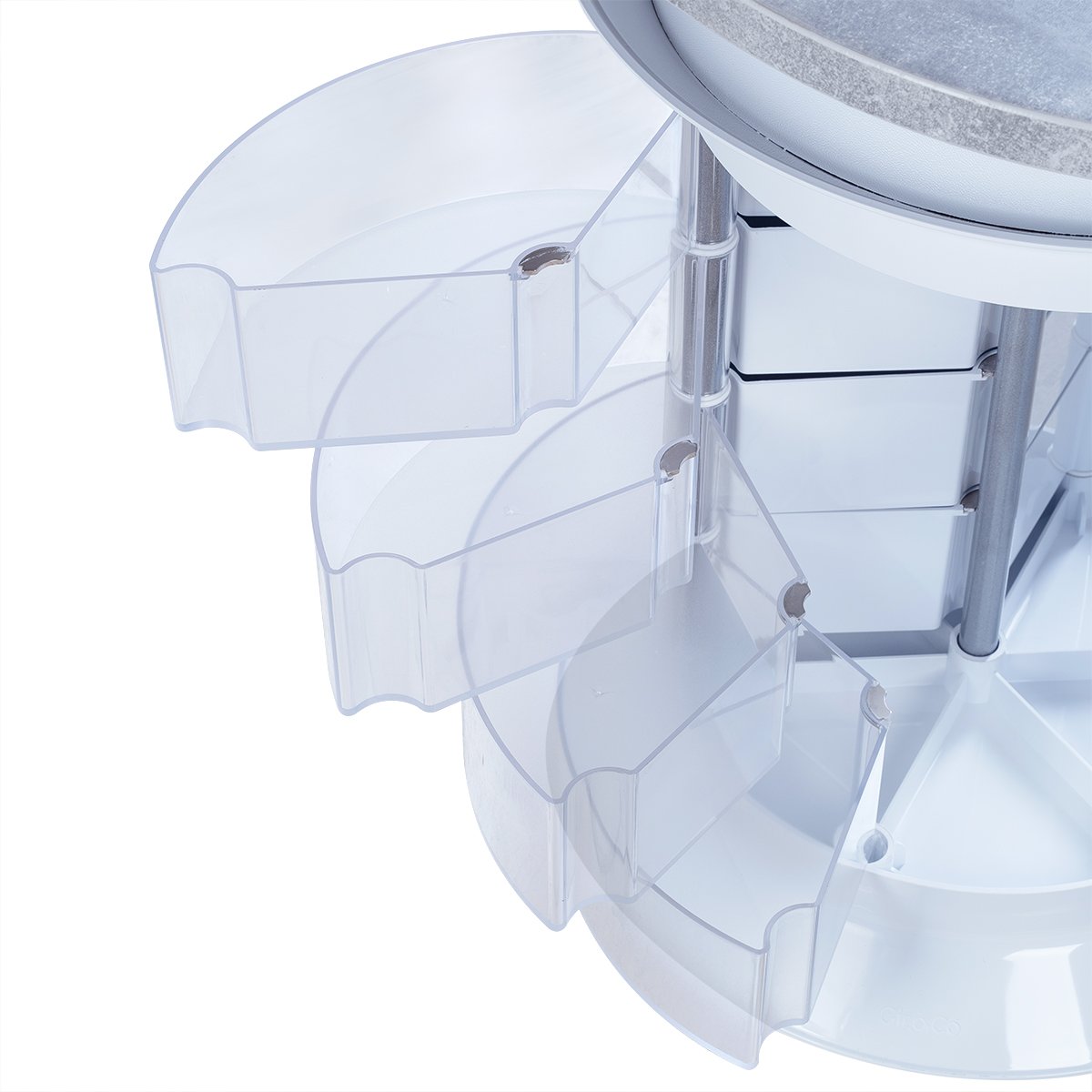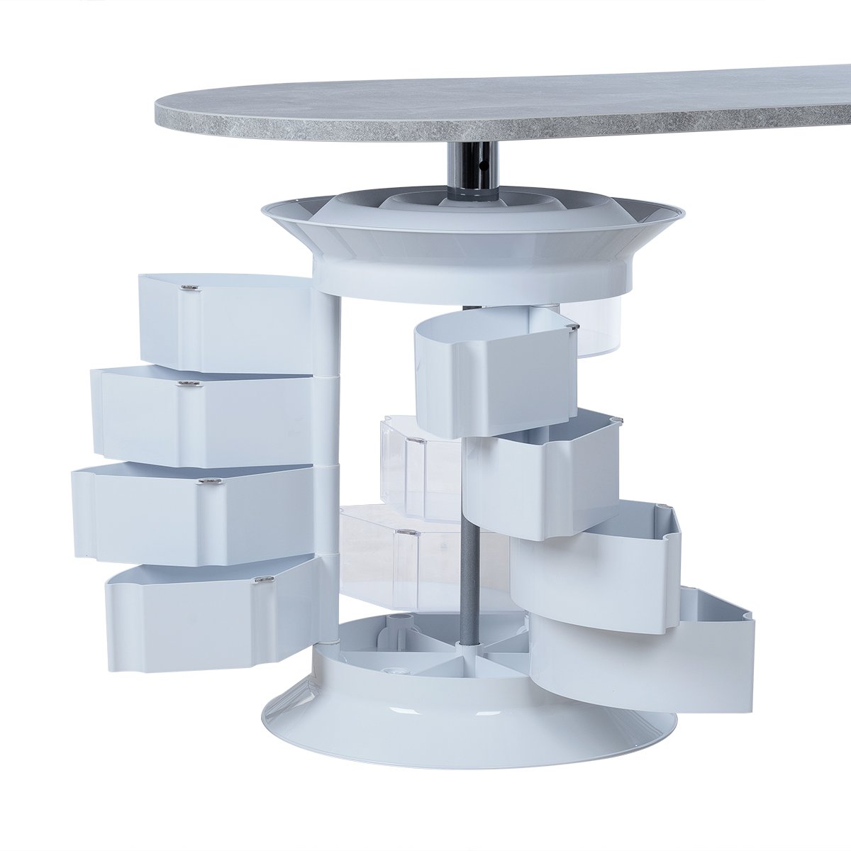 Тумба состоит из 12 выдвижных ящиков, где поместятся приспособления и расходные материалы мастера. Четыре прозрачных ящика можно использовать для инструментов, часто используемых в работе. Функция вращения тумбы поможет быстро найти необходимые принадлежности. Над тумбой есть практичная полочка, разработанная для хранения лаков.