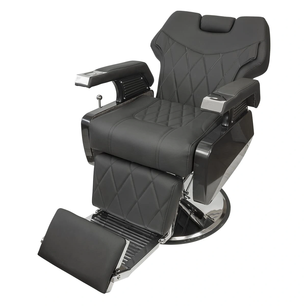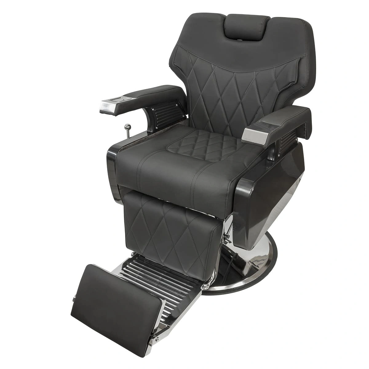 Каркас и основа из прочной стали отвечает за устойчивость массивной мебели для барбершопа. Обивка выполнена из фирменной экокожи с влагостойкими качествами. Спинка, сиденье и подножка украшены стильной прошивкой крупными ромбами. Для наполнителя использован упругий поролон. Благодаря своей структуре материал быстро восстанавливает форму после каждого использования.