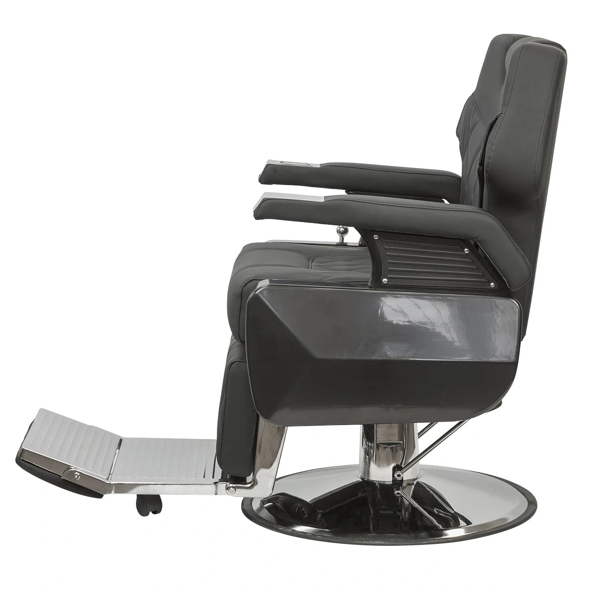 Широкое сидение с массивными подлокотниками позволит клиенту максимально расслабиться во время бритья и стрижки. Кресло дополнено большой подножкой с мягкой подушкой, что обеспечит комфорт ногам клиента.