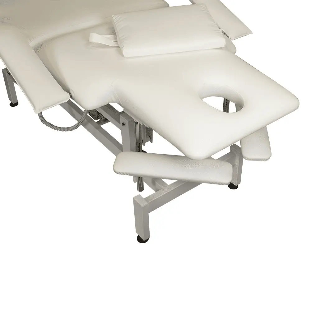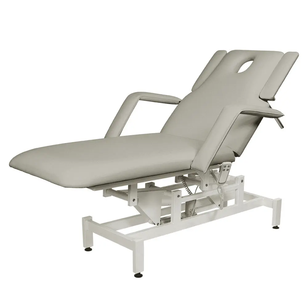 Кушетка разделена на два мягких сегмента, положение которых регулируется. С помощью двух встроенных электромоторов можно дистанционно регулировать угол наклона спинки и высоту кушетки. В комплект поставки входит удобный пульт управления электроприводом. Каркас и основание из металла с защитным покрытием.