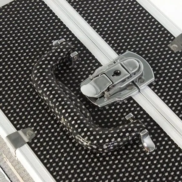 Внутри кейса просторный отсек и четыре ящика, которые выдвигаются по сторонам при открытии оборудования. Каскадная система хранения позволяет расставить средства так, чтобы они не просыпались, не деформировались в пути. Дно чемодана – еще одна функциональная деталь, где мастер может разложить объемные инструменты. Для удобной транспортировки кейс оснащен резиновой ручкой.