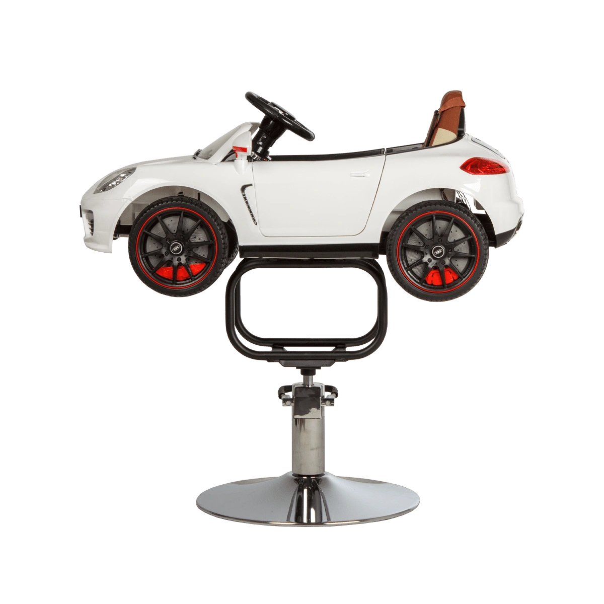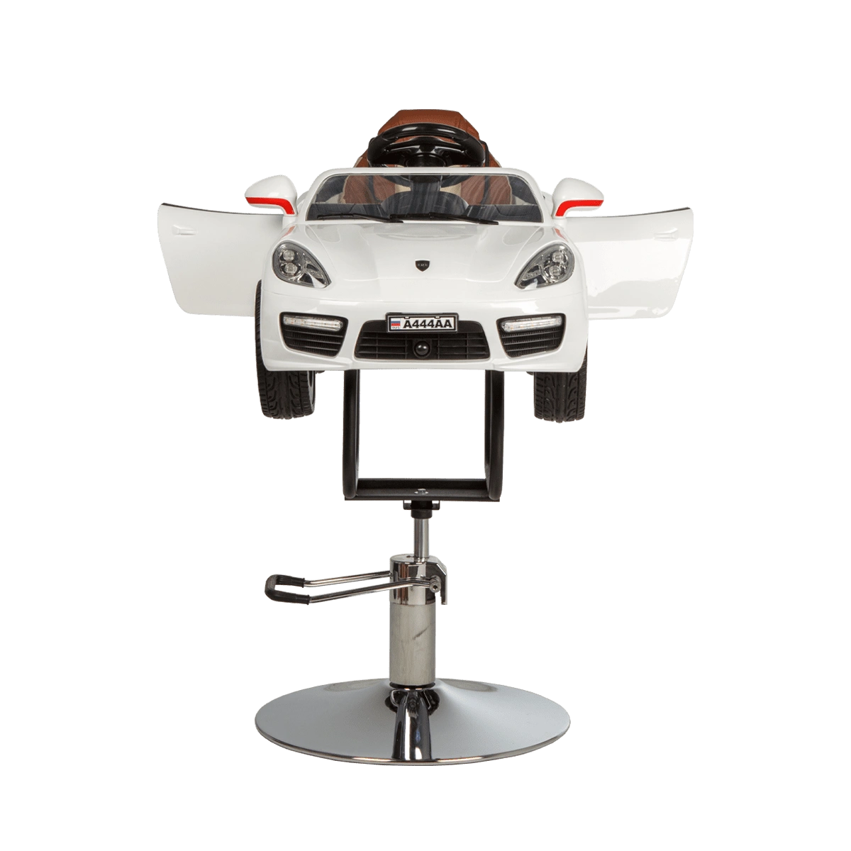 Стильное детское парикмахерское кресло машинка 01 – отличный выбор для комфорта маленьких посетителей бьюти салонов. Модель выполнена в виде белой гоночной машинки BMW с ярким привлекательным дизайном. В ней есть ключ зажигания, при повороте которого включаются фары и задние фонари. Для удобства малыша автомобиль оснащен комфортным сиденьем с высокой спинкой. Машинка установлена на металлический каркас и устойчивое хромированное основание в форме диска. Высота кресла регулируется с помощью надежного гидравлического подъемника. Данная модель подходит для детей от 3 до 6 лет.