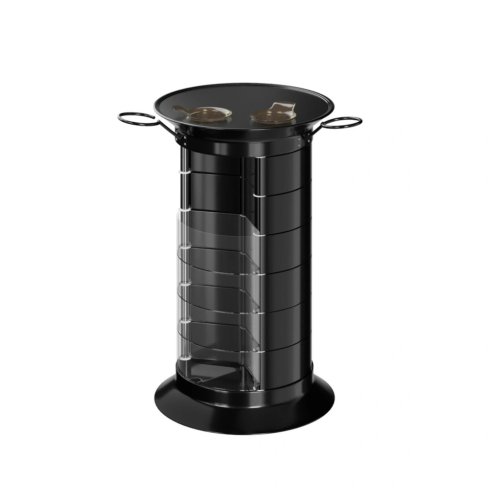 Продуманная конструкция позволит мастеру хранить все свои приспособления в одном месте. В распоряжении специалиста 16 раздвижных ящичков, которые поворачиваются вокруг стоек каркаса. Чтобы в тумбе можно было поставить высокие сосуды, с одной стороны отсутствует два ящика. Верхняя полка имеет специальные отверстия, предназначенные для емкостей и чаш. С двух сторон крышка оборудована держателями для фенов. Мобильность мебели обеспечивается шестью поворотными колесиками. Тележка может быть использована для обстановки двух рабочих мест.