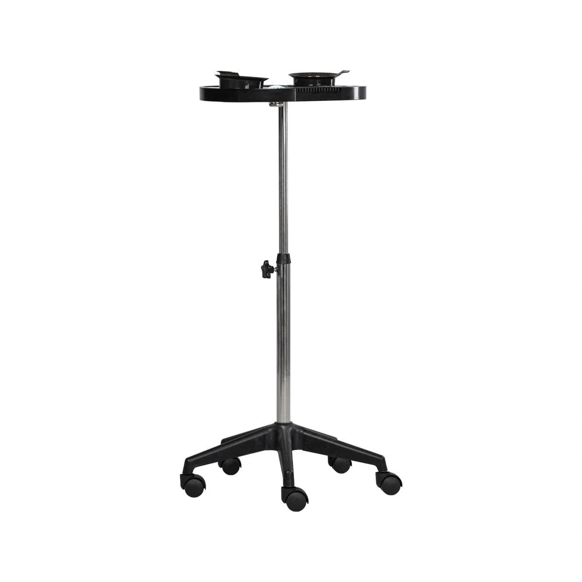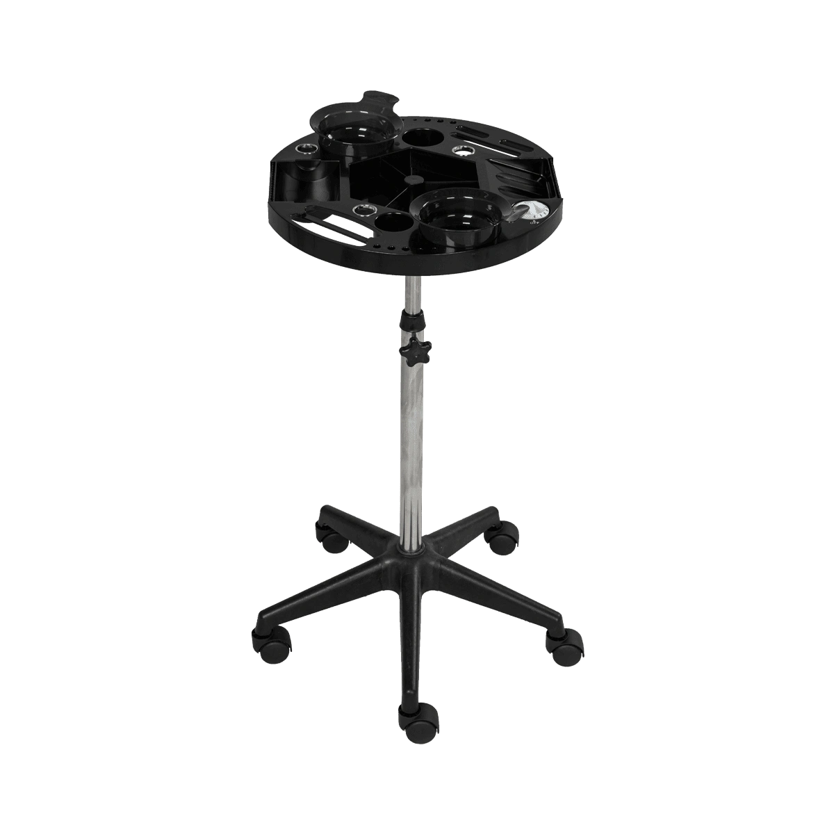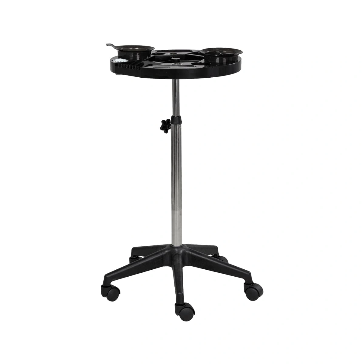 Каркас тележки изготовлен из прочного металла, благодаря пластиковому пятилучью на колесиках ее легко перемещать. Специальное хромированное покрытие надёжно защитит от коррозии. Верхняя часть тележки – открытая полка с двумя съёмными чашами, что весьма удобно не только для работы, но и после неё, чаши легко моются.