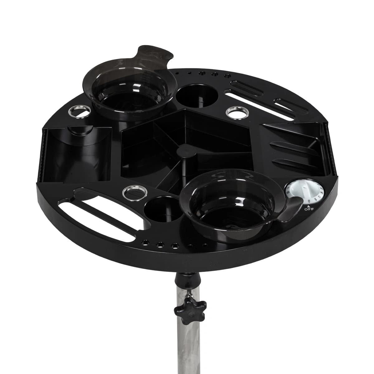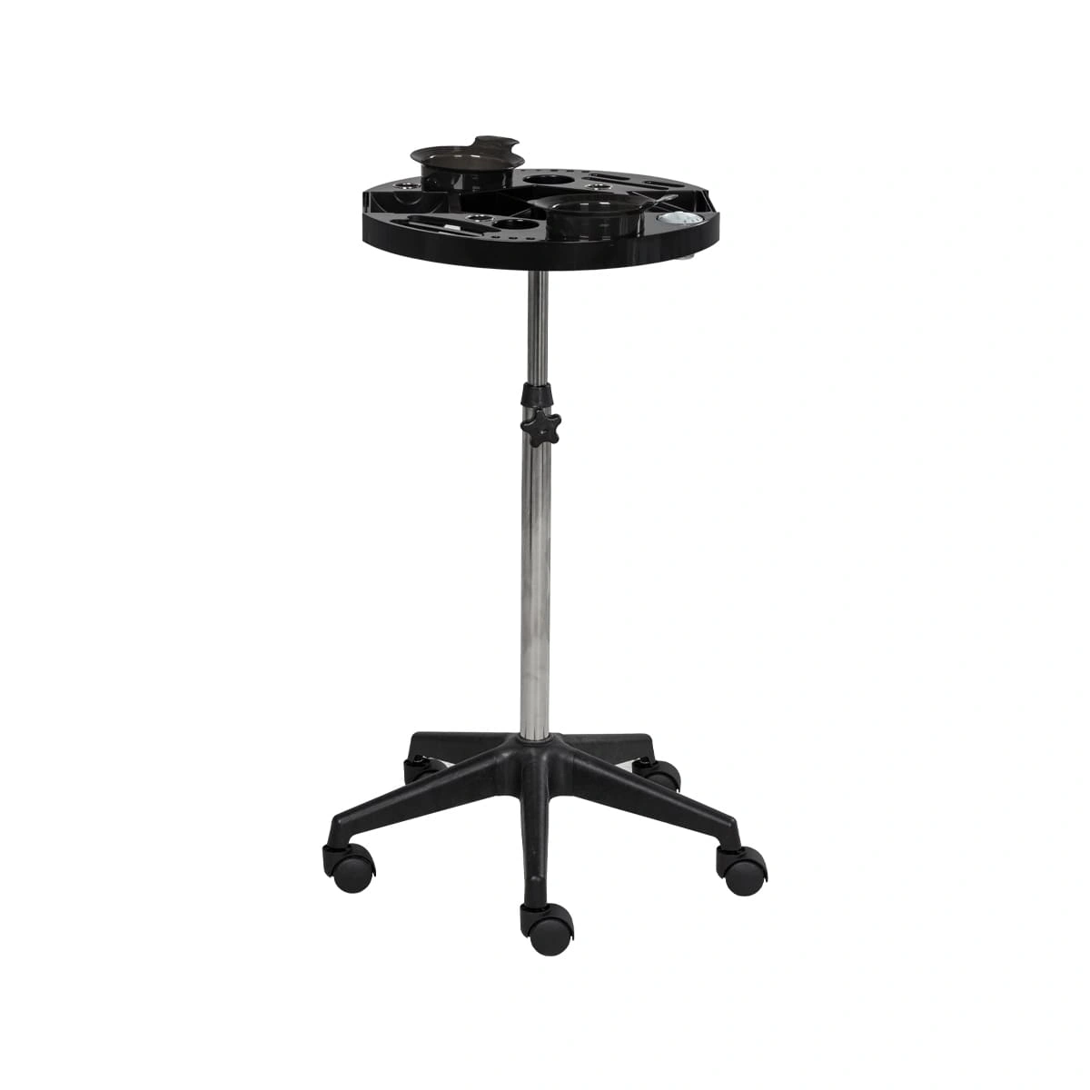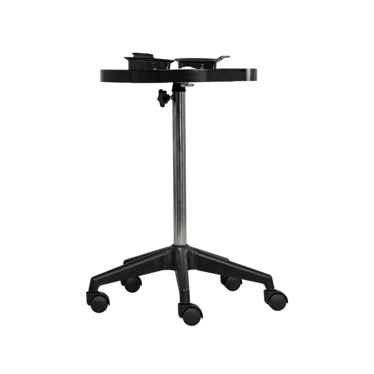 Каркас тележки изготовлен из прочного металла, благодаря пластиковому пятилучью на колесиках ее легко перемещать. Специальное хромированное покрытие надёжно защитит от коррозии. Верхняя часть тележки – открытая полка с двумя съёмными чашами, что весьма удобно не только для работы, но и после неё, чаши легко моются.