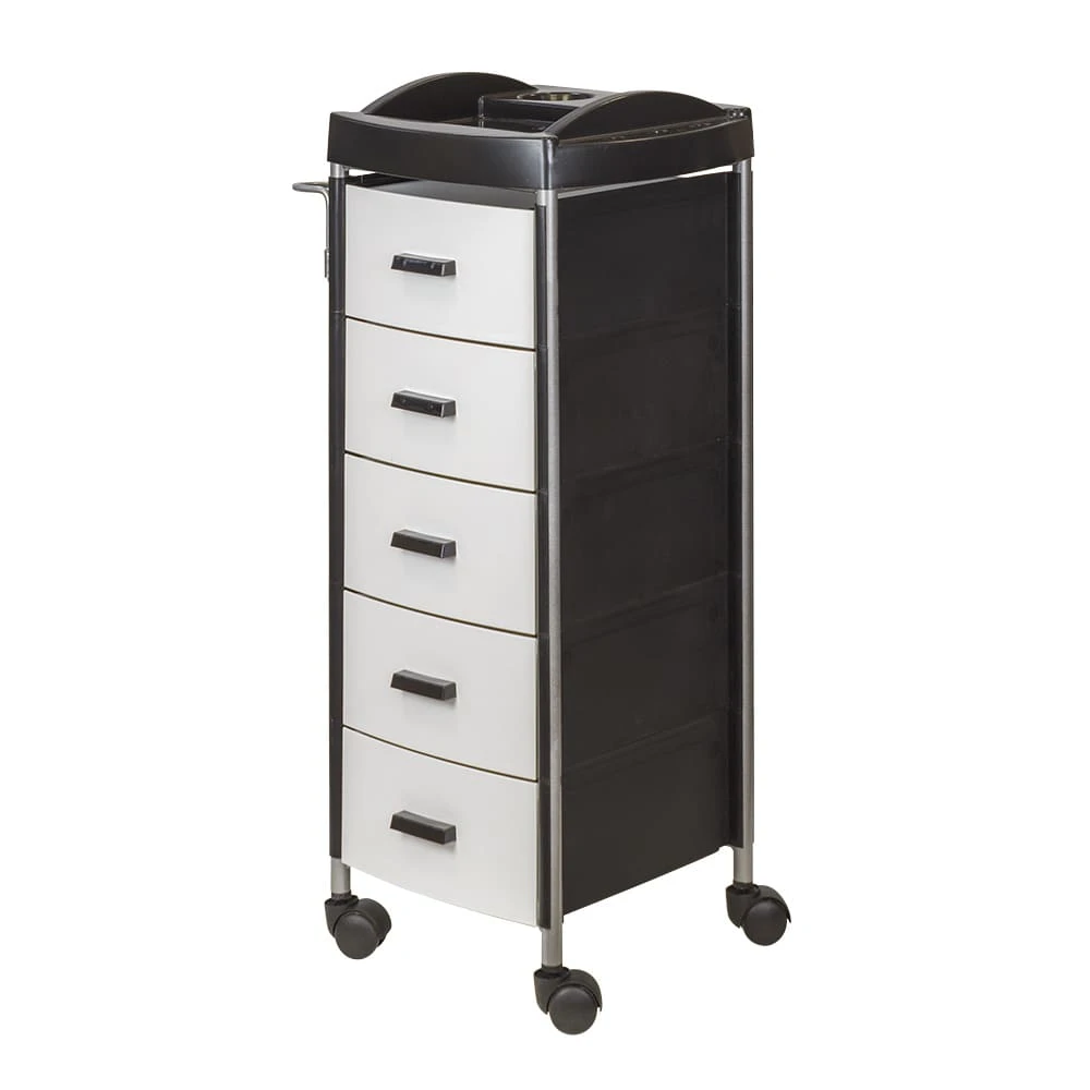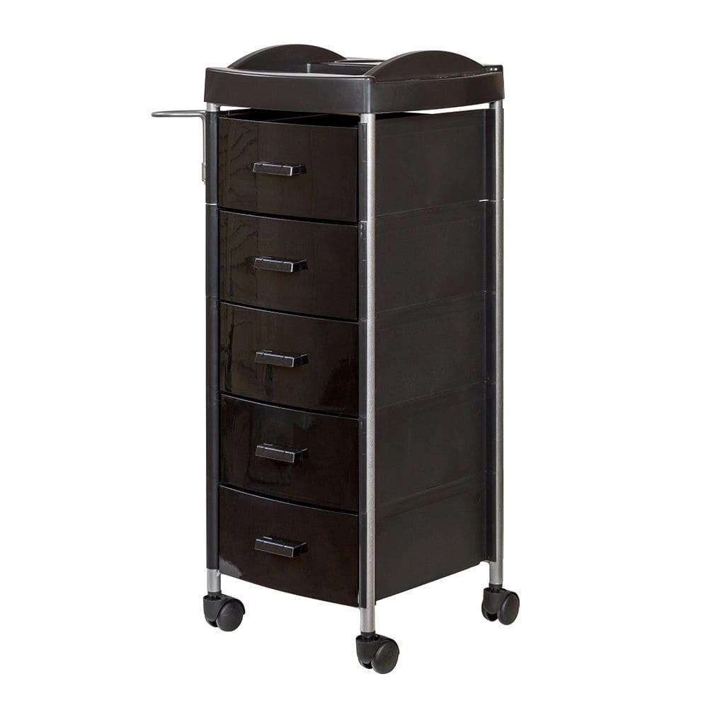 Для инструментов и расходных материалов в парикмахерской тележке есть пять вместительных ящиков. На верхней полке удобно поставить приспособления, используемые в работе. На боковой стене есть удобный держатель для фена. Легкое и бесшумное перемещение обеспечено маневренными колесами.