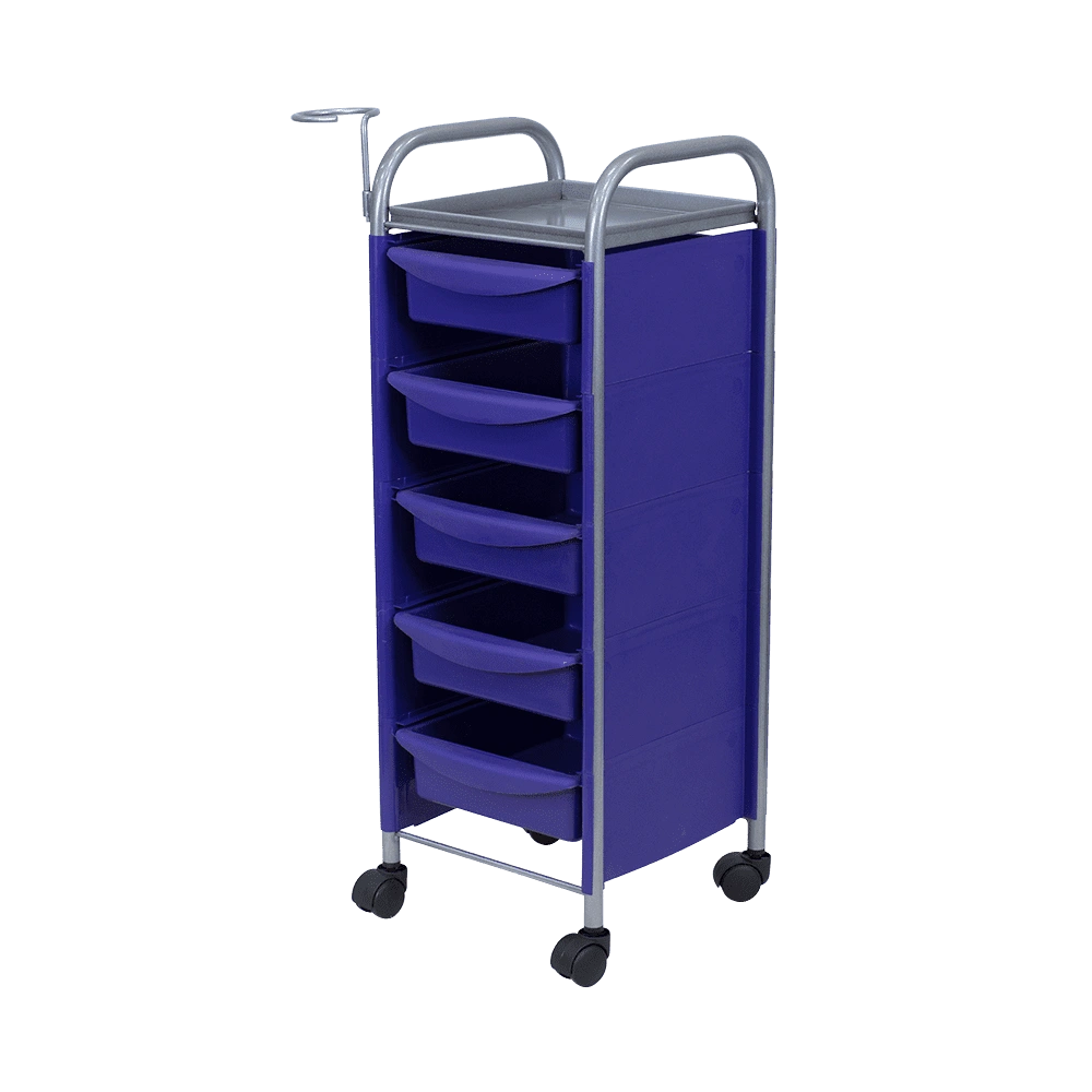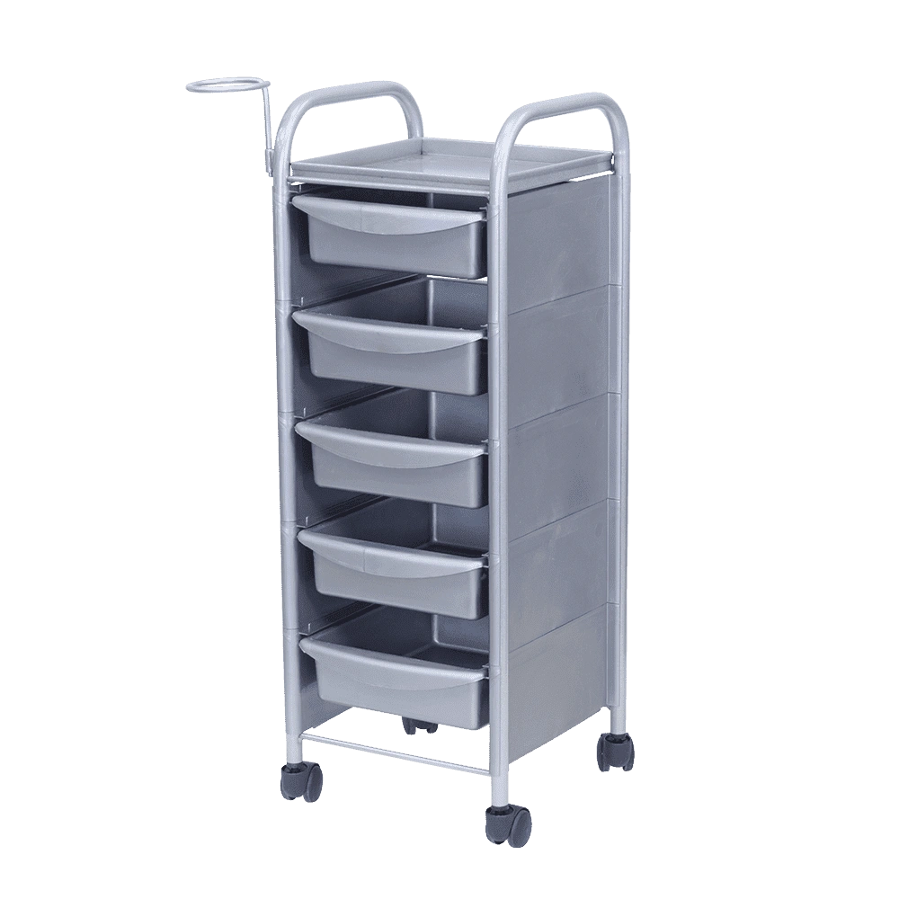 Комплектация: каркас из металла на пластиковых колесах, боковые пластиковые панели, выдвижные ящики, верхняя полка, металлический держатель для фена.