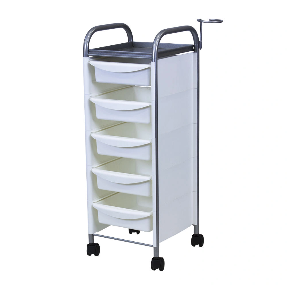 Комплектация: каркас из металла на пластиковых колесах, боковые пластиковые панели, выдвижные ящики, верхняя полка, металлический держатель для фена.
