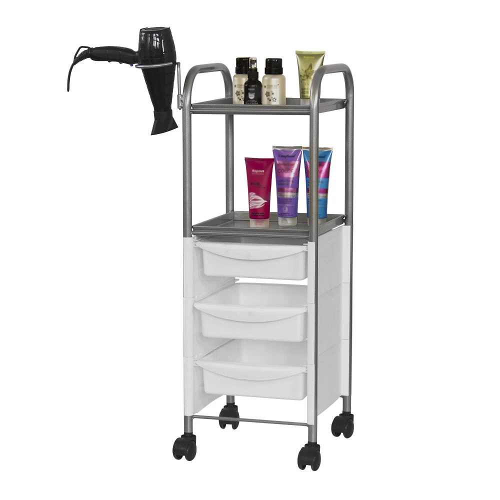 Комплектация: основа на маневренных колесиках, боковые панели, три ящичка, 2 полочки, держатель для фена