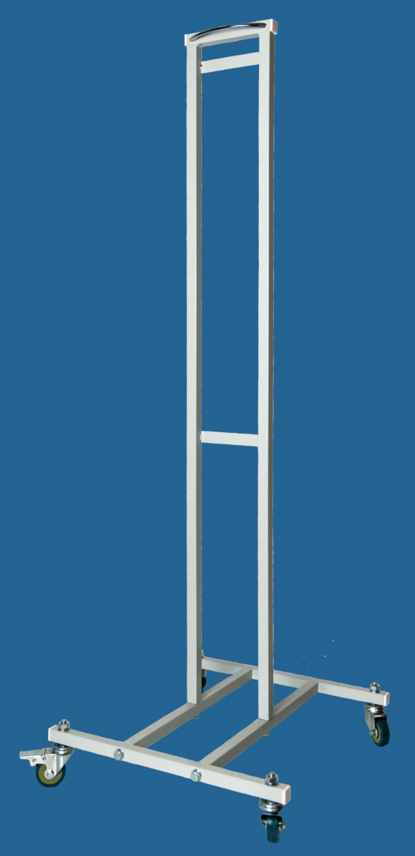 Передвижная подставка содержит четыре резиновых колёсика для перемещения по поверхности пола. Для фиксации подставки передвижной колёса снабжены специальным тормозным устройством. Подставка выполнена из профильной стальной трубы 20х20 мм и покрыта химически стойким порошковым покрытием. При необходимости подставка может легко разбираться и размещаться в небольшом объёме.