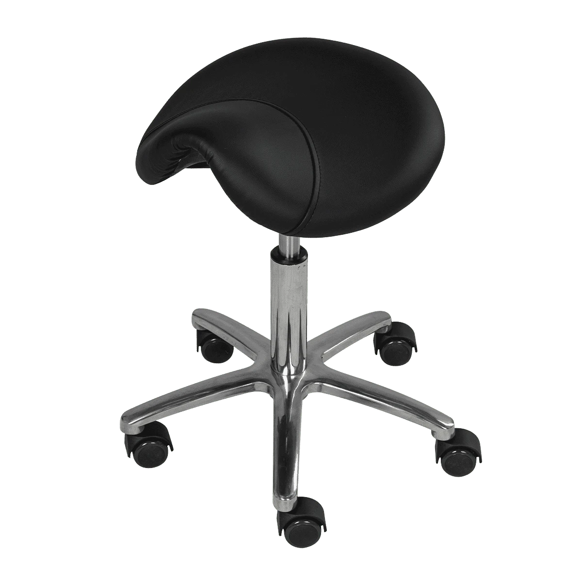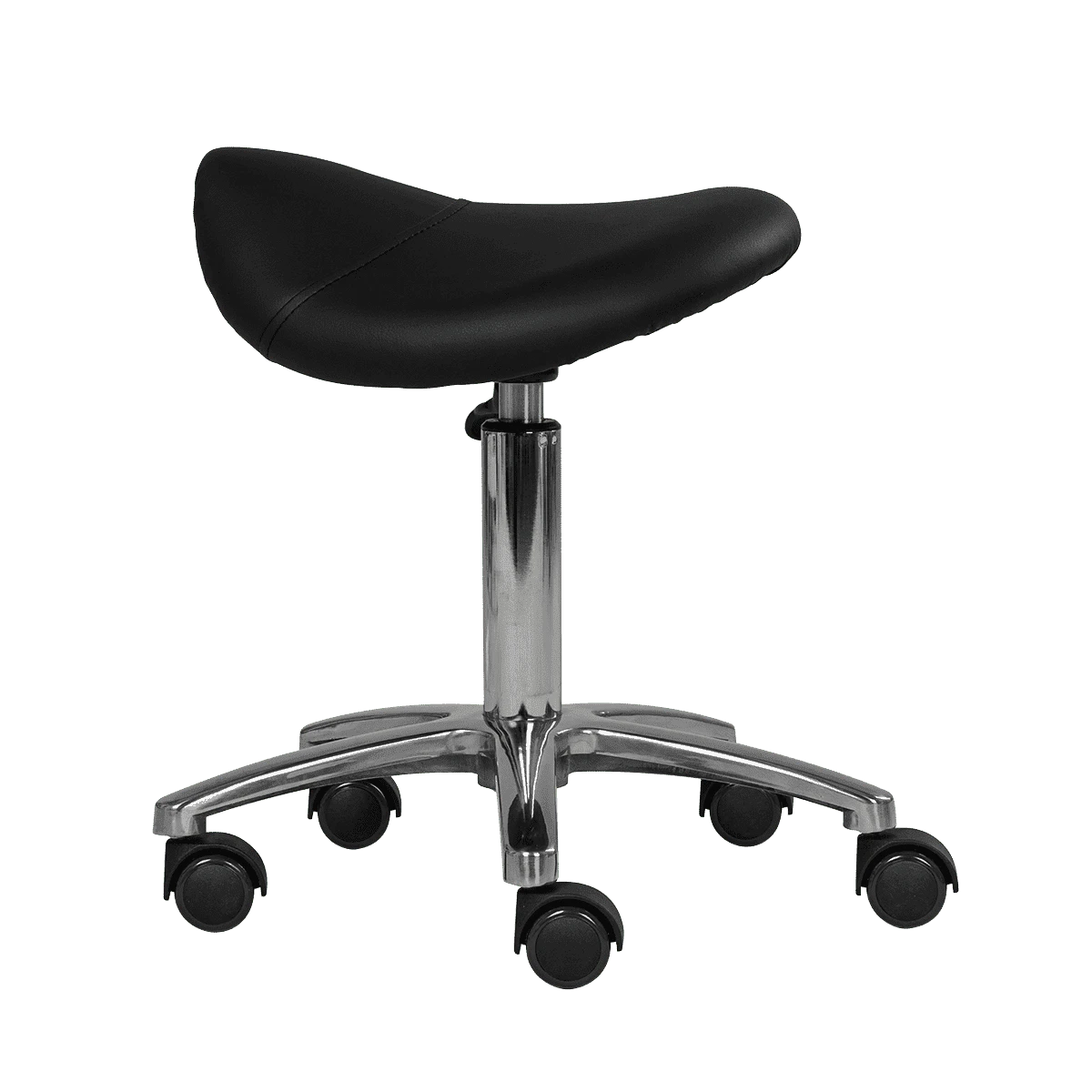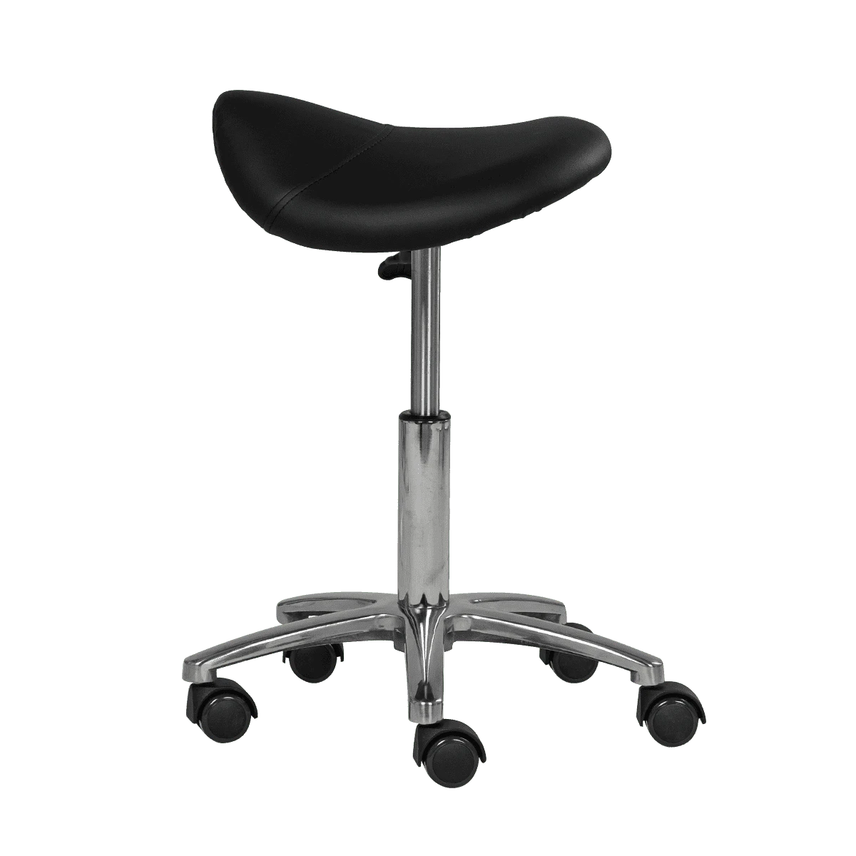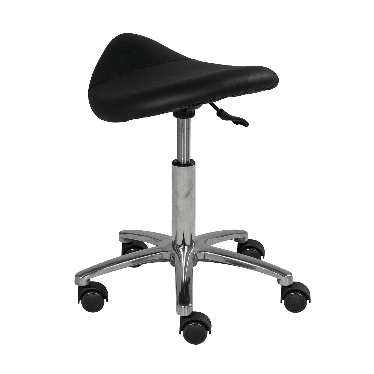 Стулья данной конфигурации, с сиденьем в форме седла, пользуются популярностью среди профессионалов. Такой стул позволяет снизить утомляемость и предотвращает появление болей в спине и ногах на протяжении и после рабочего дня. Неоспоримым преимуществом модели является наличие удобной опоры для ног. Она, как и основание, выполнена из хромированного металла. Без усилий перемещать стул по помещению позволяют легко вращающиеся колеса из прочного черного пластика. Они также обеспечивают устойчивость стула на полу с любой поверхностью.