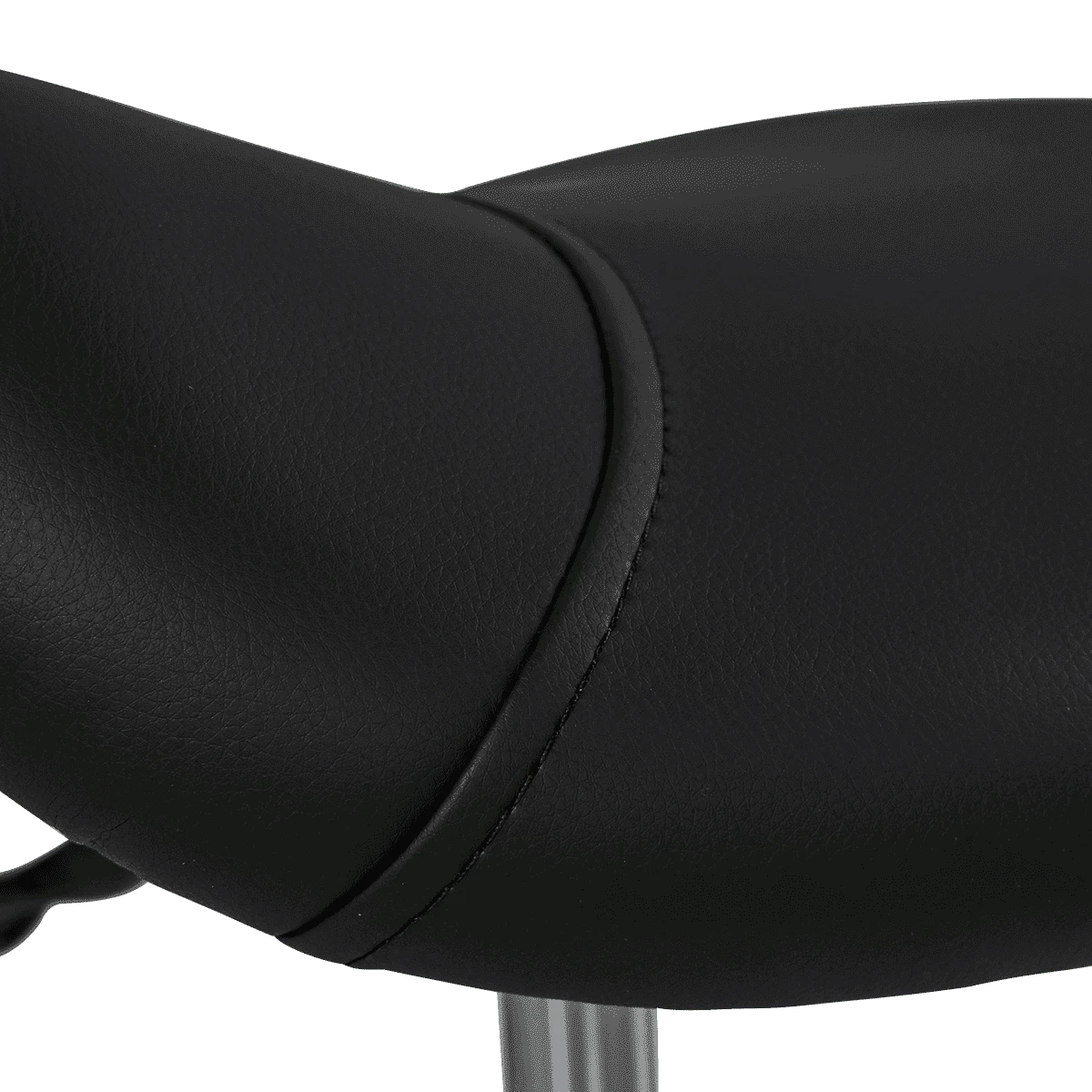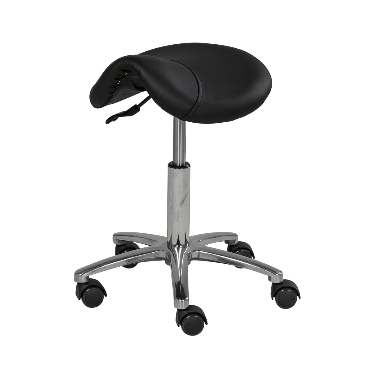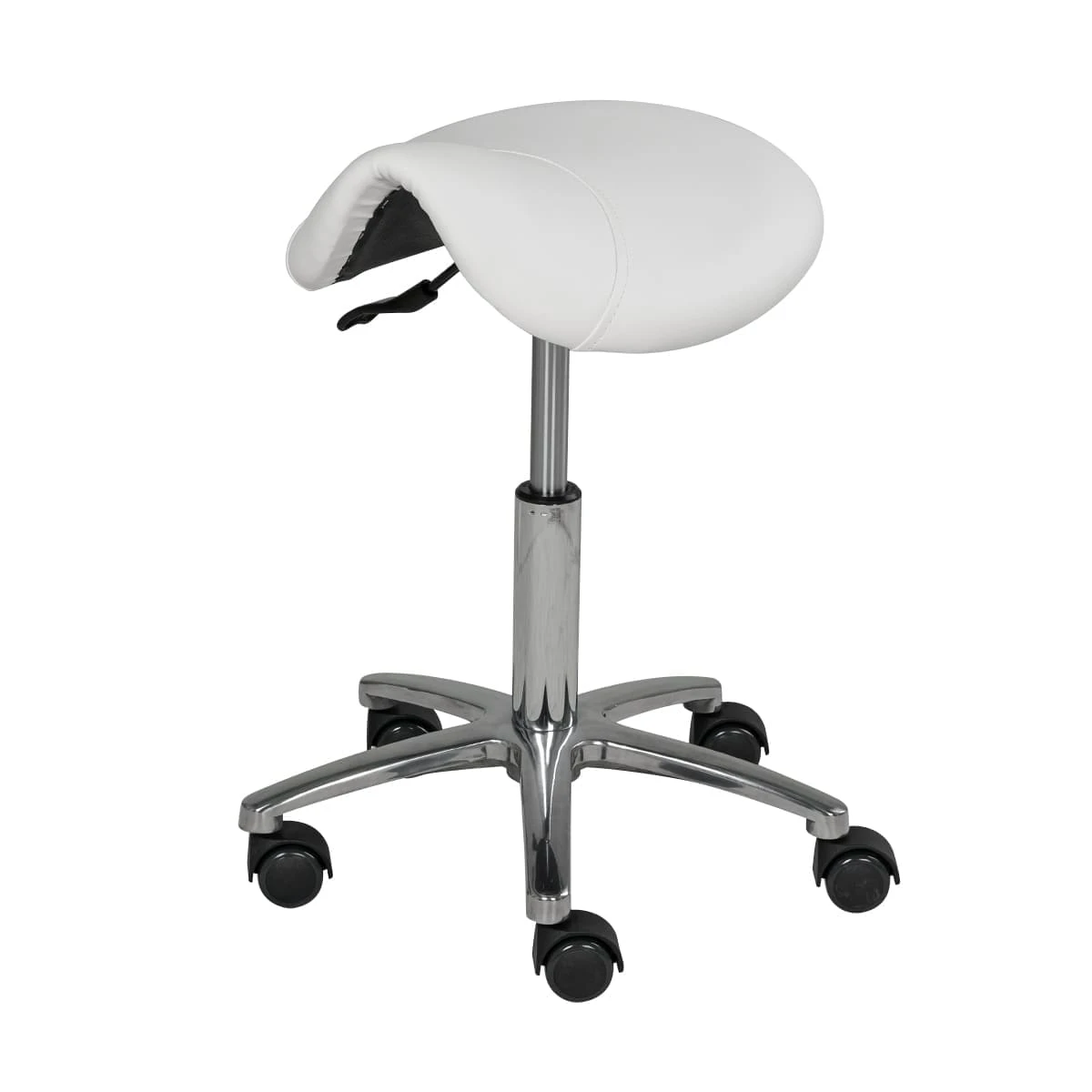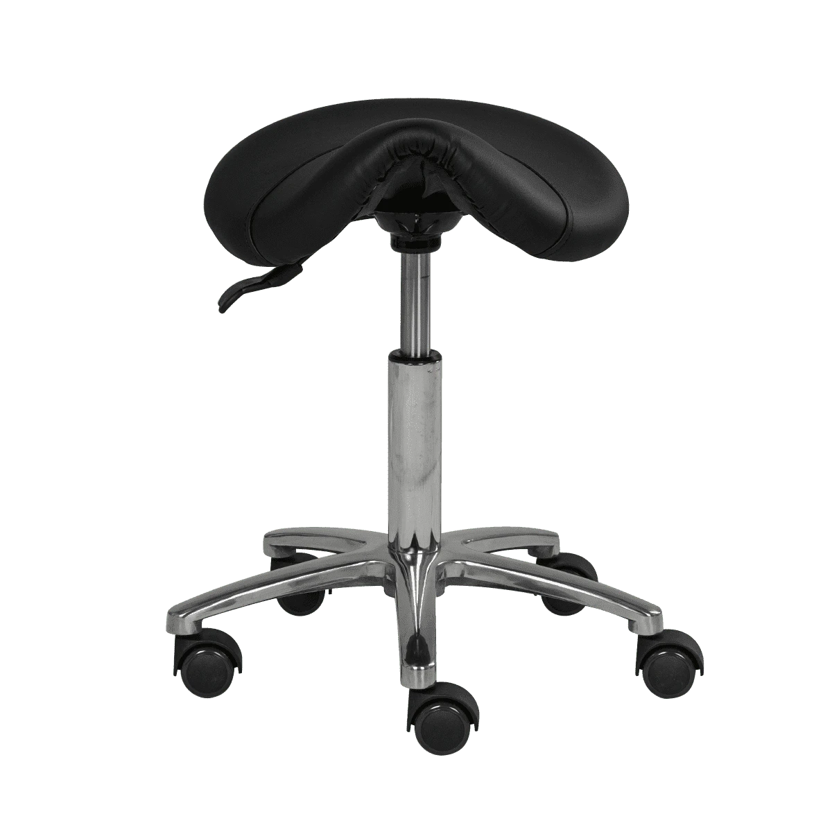 Стулья данной конфигурации, с сиденьем в форме седла, пользуются популярностью среди профессионалов. Такой стул позволяет снизить утомляемость и предотвращает появление болей в спине и ногах на протяжении и после рабочего дня. Неоспоримым преимуществом модели является наличие удобной опоры для ног. Она, как и основание, выполнена из хромированного металла. Без усилий перемещать стул по помещению позволяют легко вращающиеся колеса из прочного черного пластика. Они также обеспечивают устойчивость стула на полу с любой поверхностью.