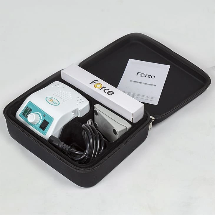 Устройство – блок питания с подсоединенной ручкой-фрезером. В зависимости от этапа работы и зоны обработки, меняется фреза, которая крепится в цанговом зажиме за считанные секунды. Специальный зажим плотно фиксирует инструмент в наконечнике и не допускает ее проворачивания во время рабочего процесса. Сменные фрезы удобно расставить в специально предусмотренном месте в корпусе блока. Маникюрное оборудование складывается в компактную сумку, которую можно взять с собой. В комплекте есть ножная педаль, выполняющая функцию выключения и выключения.